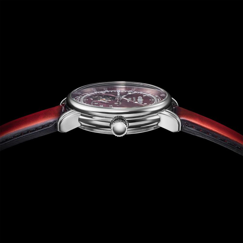 文字盤を緋色で包んだ[7662-7]は、夕日に照らされた飛行船をモチーフに開発されました。本格的な航空の時代の幕を開けたツェッペリン飛行船は、“空の旅”というこれまでにないロマンを提供し、人々は熱い想いをたぎらせていました。この文字盤に彩られたレッドカラーは、1929年にLZ127号(通称 グラーフ・ツェッペリン伯号)が世界一周の偉業に挑んだ際、夕日に照らされた飛行船を体現しています。