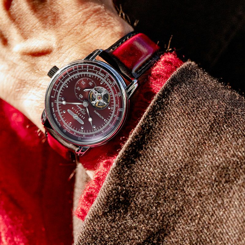 光を受けるとわずかな濃淡を見せる文字盤は夕焼け空が見せるエモーショナルな情景を想起させ、ツェッペリンが持つ情熱や歴史への敬意も表します。