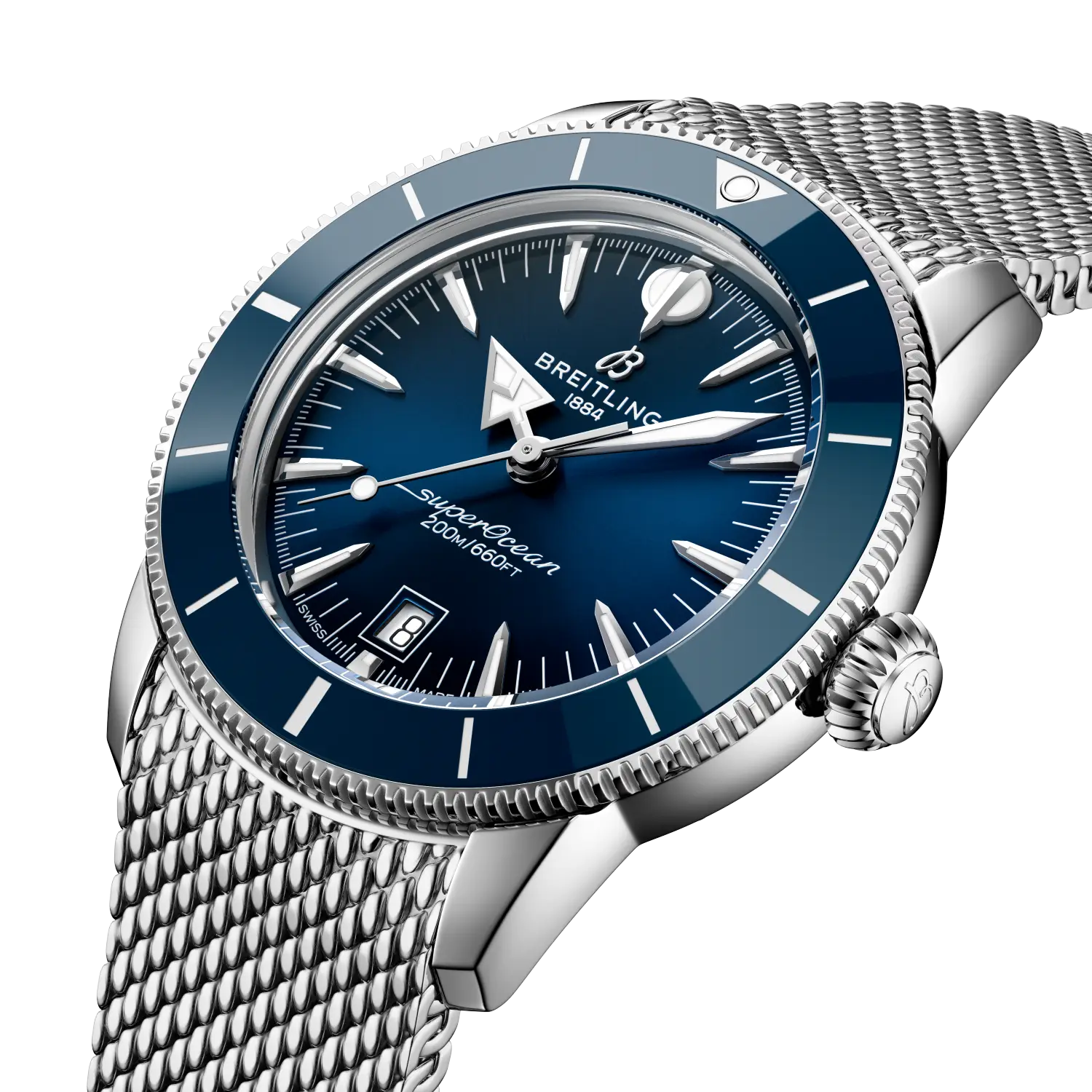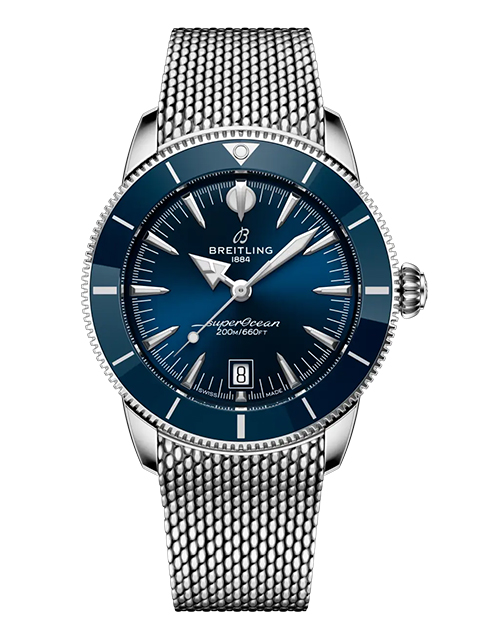 波間も、ウォーターフロントも、自在に駆ける。 スーパーオーシャン ヘリテージは、ただのダイバーズウォッチではありません。最初からそうでした。ブライトリングがこのモデルを初めて発表したのは1957年。当時の他のダイバーズウォッチとは一線を画すアプローチをとっていました。Ref. 1004(洗練された3針モデル)とRef. 807(世界初の本格的なダイバーズ・クロノグラフ)は、単に水中探検のためのツールではなく、スタイルも重視したデザインでした。特徴的な槍と矢の形をした針、アノダイズ処理を施した回転ベゼル、そして自然な美しさを備えた洗練されたプロポーションが、海とスタイルを愛する冒険家たちを魅了しました。その哲学は、スーパーオーシャン ヘリテージにしっかりと受け継がれてきました。1950年代の精神を宿しながら、今の時代に合わせて磨き上げられました。 最新のSuperocean Heritageは、オリジナルの特徴をすべて踏襲し、さらに洗練されています。このコレクションには、ブライトリング初の自社製3針ムーブメント「キャリバーB31」が搭載されています。セラミックインレイのベゼルは優れた耐傷性を提供し、一体型のメッシュメタルまたはメッシュラバーブレスレットはケースにぴったりとフィットし、折りたたみ式クラスプでしっかりと固定され、すっきりとした防水仕上げを実現します。6時位置に控えめな日付表示窓と、オリジナルのシグネチャー針(時間を示す矢印、分を示す槍)が、表面の上でも下でも、視認性とバランスを確保します。