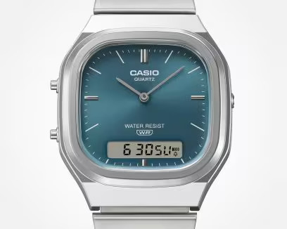 レトロモダンな装いのアナログ・デジタルコンビネーションモデル、AQ-240です。 角型フェイスにアナログ時計とデジタル表示を組み合わせ、丸みのあるケース形状を採用しています。曲線を基調としたデザインが洗練された印象に。 ダイアルには旭光仕上げを施し、上品な光沢感を演出。メタリックインデックスのアクセントで、クラシックとモダンを融合させています。6時位置のデジタル表示も視認性とデザイン性を両立したバランスのよいレイアウトです。 レトロな趣に現代的な美しさをプラスしました。