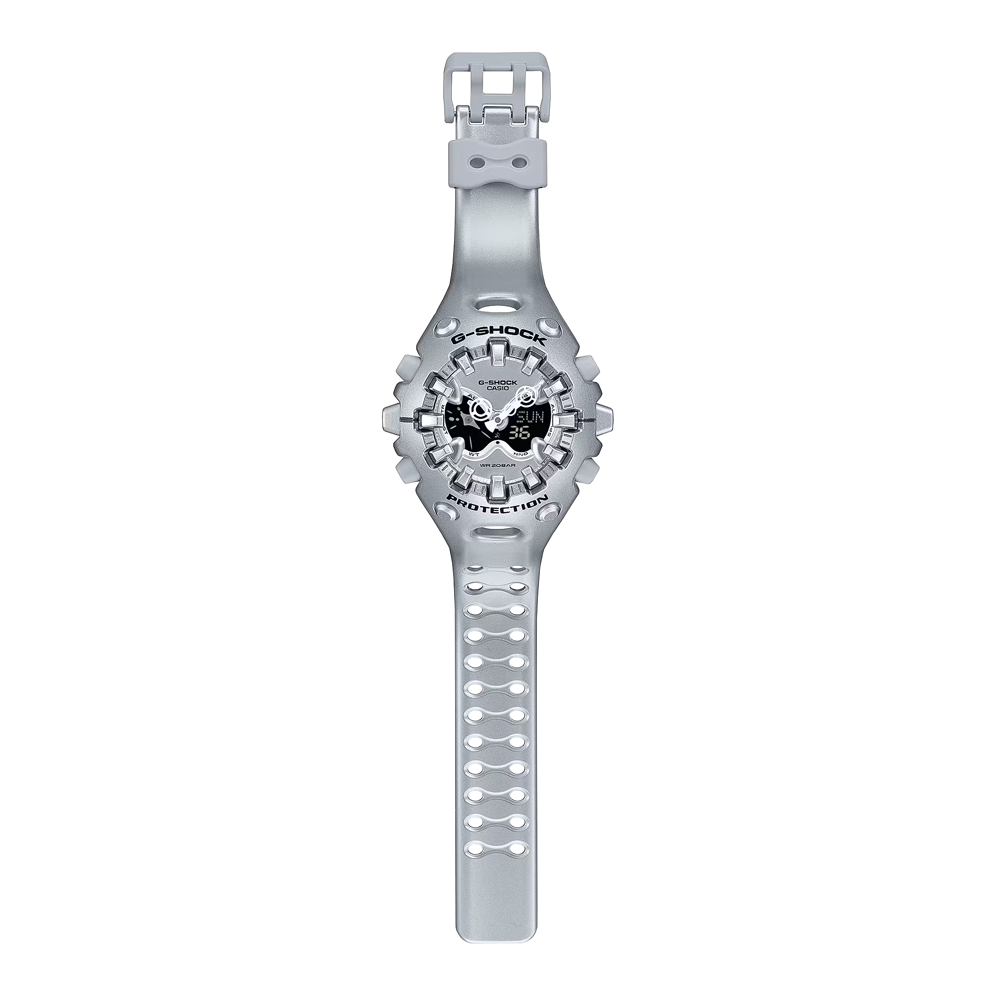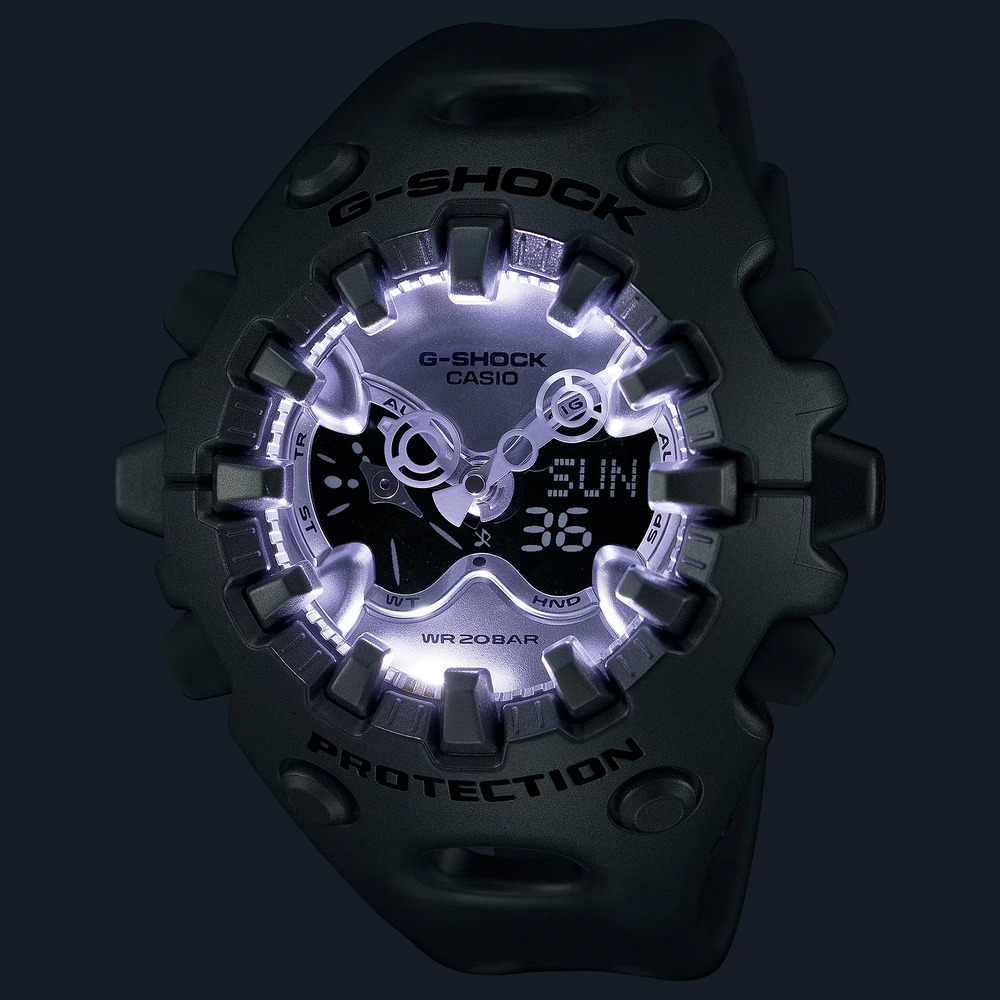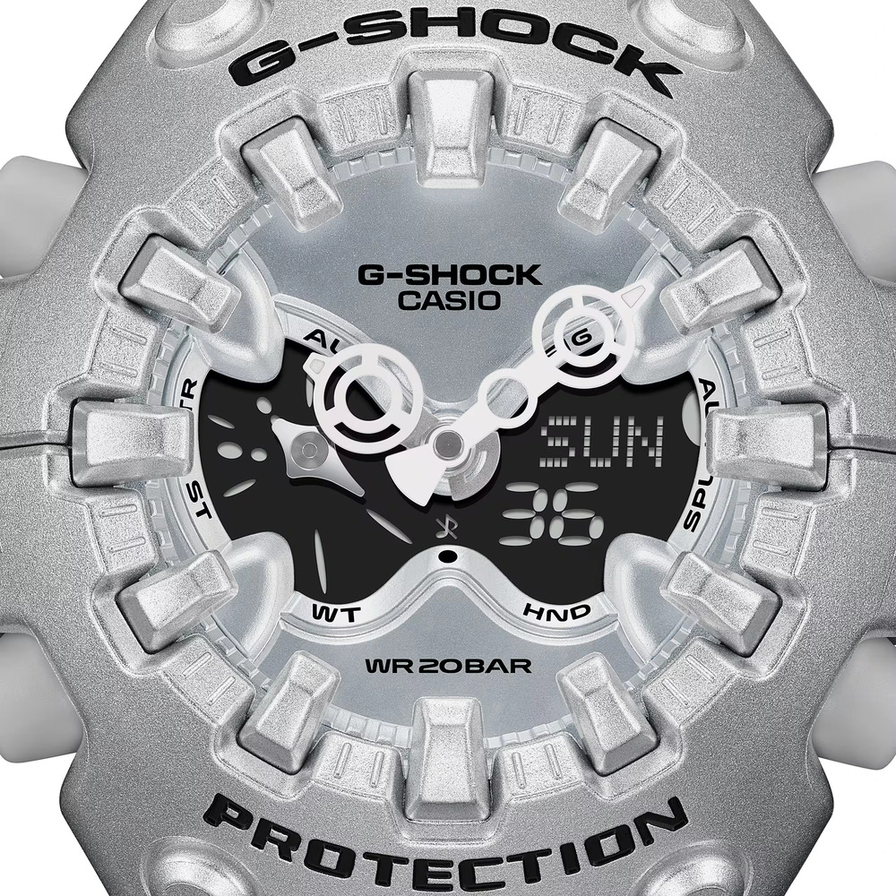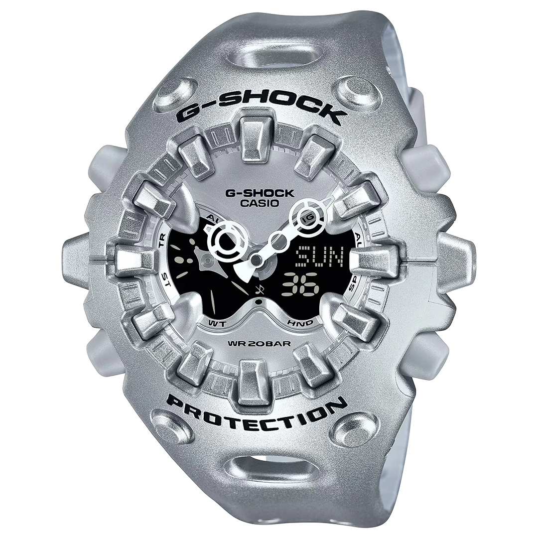タフネスを追求し進化を続けるG-SHOCKから、構造とデザインにこだわったシリーズのご紹介です。 エッジの効いたパーツを組み合わせた有機的な外装フォルム、2つの穴が大きな特徴となっているショックリリース針など常識を覆す斬新な発想で、強さを求めて挑戦を続けるG-SHOCKのアイデンティティを形にしました。 モジュールを保護するセンターケースを、ベゼル・バンド一体構造の外装パーツでカバー。大型の立体インデックスをガラス上面に配置することで、衝撃を緩和するバンパーの役割を持たせました。G-SHOCK独自の耐衝撃性能をキープしながら、ユニークかつ力強い外装デザインを実現しています。 衝撃の影響を受けやすい針をシャフトに固定せず、磁石の力で取り付けるマグネティックホールディング構造を開発しました。この構造で取り付けたショックリリース針(分針)は、磁力で固定されているため、受けた衝撃を受け流すことができます。本構造を採用することで、針の大型化やデザイン自由度を上げることが可能になりました。 ※磁力で固定される構造のため、衝撃や振動で分針が揺れることがあります。また、衝撃や振動が加わった直後、および強い磁気にさらされた際は、一時的に分針がずれる場合がありますが、数分以内に正しい位置に戻ります。 アナログ・デジタルコンビネーションタイプのフェイスに、オープンワーク(透かしの部分をつくる技法)を施したダイアルとフルスクリーンLCDのレイヤー構造を採用。センターに異形タイプの時分針、液晶内に小針をレイアウトするなど、斬新なデザインに仕上げています。 大容量電池の採用と低消費電力化により、アラームやライトなどの機能を搭載しながら電池寿命約10年を実現したモデルです。