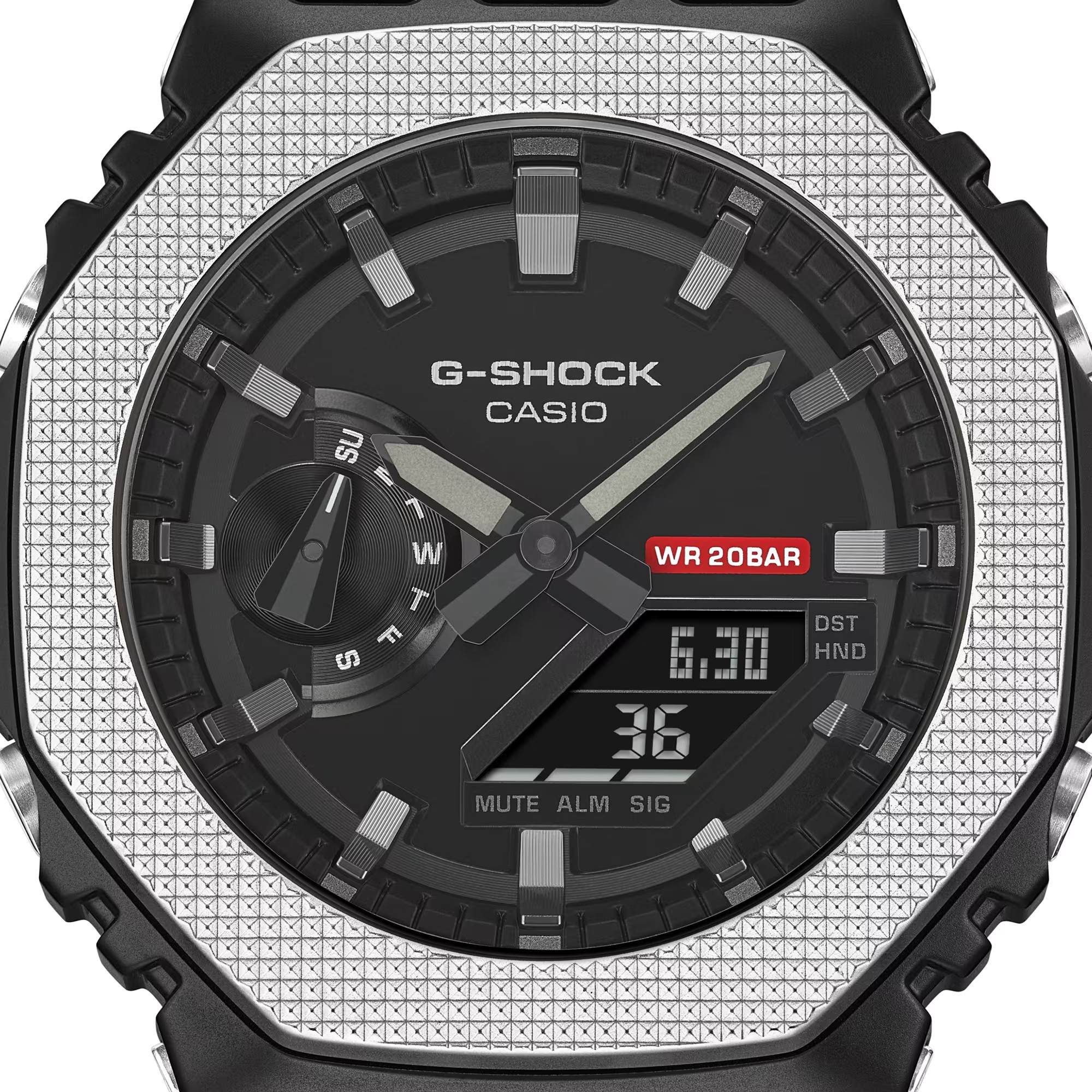 モダンなインダストリアルデザインをテーマに機能美を追求し、G-SHOCKの耐衝撃性の要素をシンプルにデザインに落とし込んだモデルです。 シンプルさと機能美の共存を目指し、無彩色のカラースキームを採用。G-SHOCKの耐衝撃性を象徴するメタルの八角ベゼルには、モダンインダストリアルデザインでも多く見られるチェッカリングパターンを施し、メタルベゼルや機能表示をマーキングした赤いアクセントカラーが機能性を豊かに表現しています。 ベゼルの切削穴からは、耐衝撃構造を実現するためにモジュールを保護しているガラスファイバー強化樹脂製のセンターケースが見え、耐衝撃構造を視覚的に表現しています。 シンプルで普遍的なデザインと実用的な機能を併せ持ち、長く愛用できるアイテムです。