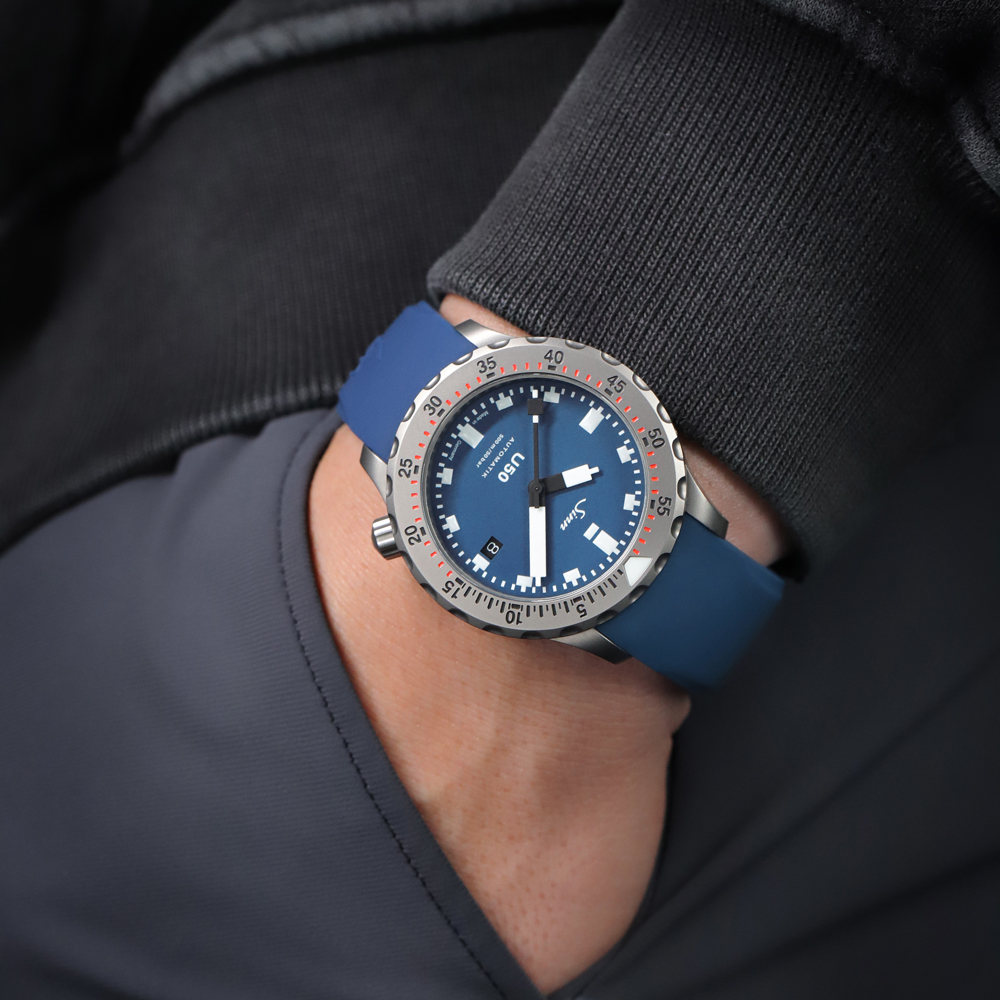 U50 Bはダイバーのための精密機器であると同時に、印象的なマットブルーの文字盤は即座に視線を捉え、最高水準のプロフェッショナリズムを表現すると同時に、この時計の妥協なき機能性をデザインで強調しています。完璧なコントラストを生み出す白色の夜光インデックスと針がその役割を果たし、卓越した視認性を持つ調和のとれた全体像が実現しました。