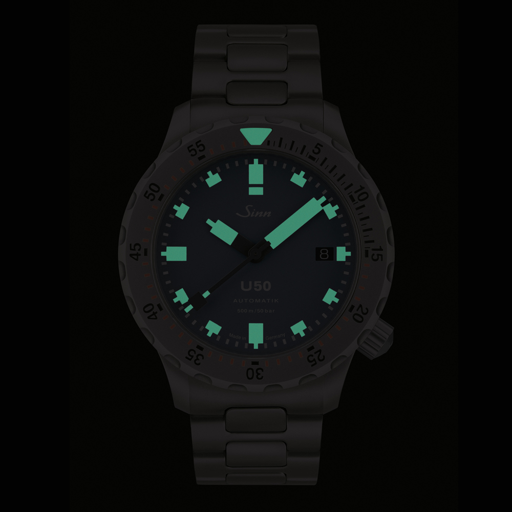 ジンの伝統に則し、U50 Bは洗練されたデザインと技術的卓越性を融合しています。ケースとリューズには、最高レベルの非磁性を持つ高強度・耐海水性のドイツ潜水艦Uボート・スチールで製造しています。この素材は通常、極限の海洋用途にのみ使用されます。特殊結合方式の回転ベゼルには、テギメント・テクノロジーによる硬化処理を施しているため、特に耐傷性に優れています。実用的な配慮として、4時位置に配置したリューズは手の甲への圧迫を防止します。