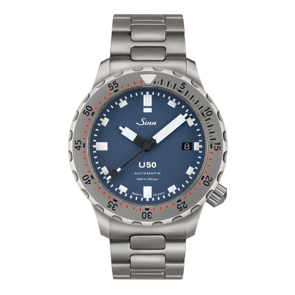 U50 Bはダイバーのための精密機器であると同時に、印象的なマットブルーの文字盤は即座に視線を捉え、最高水準のプロフェッショナリズムを表現すると同時に、この時計の妥協なき機能性をデザインで強調しています。完璧なコントラストを生み出す白色の夜光インデックスと針がその役割を果たし、卓越した視認性を持つ調和のとれた全体像が実現しました。