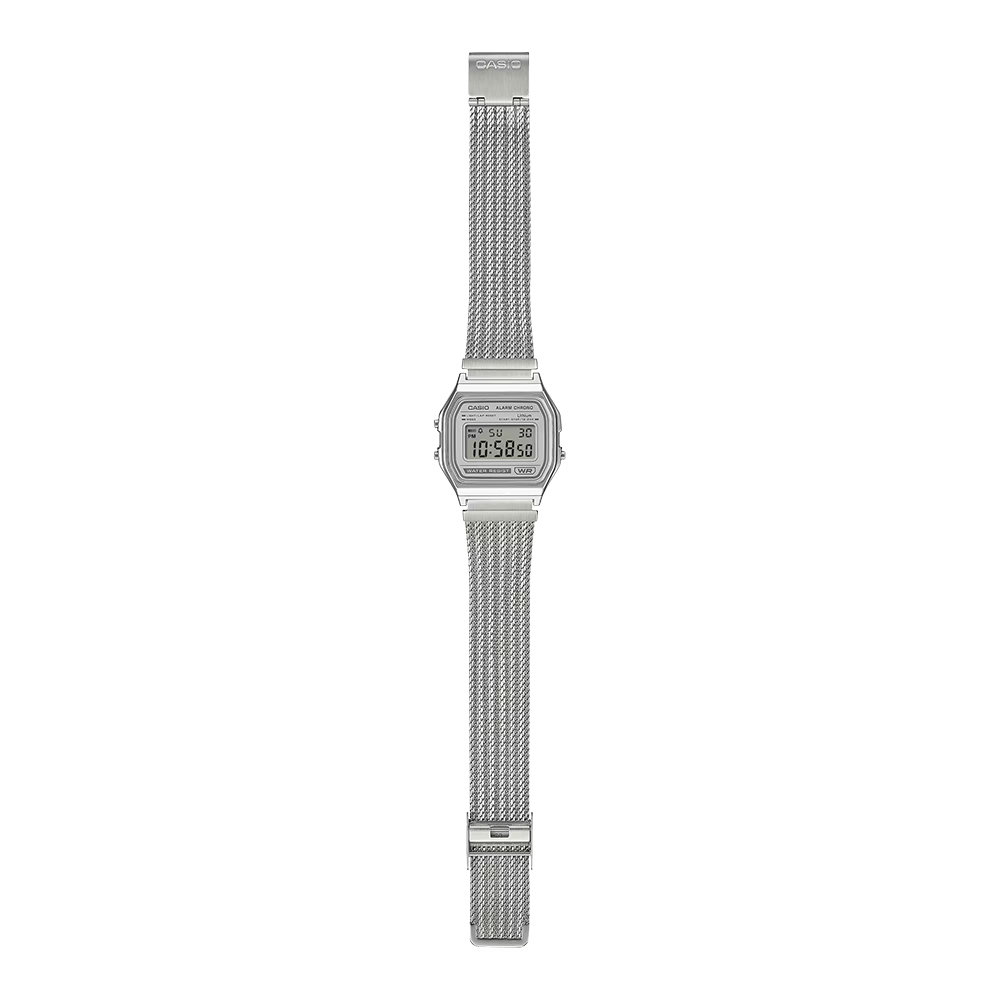 使い勝手の良さで根強い人気を誇るデジタルウオッチA158を、メッシュバンド仕様に仕立てたスタイリッシュなウオッチです。 メッシュバンドをベースに縦方向にプレスを入れ、立体感のあるデザインを実現しました。腕元に洗練された印象を添えつつ快適な装着感を実現します。 シンプルでありながら、編み込まれた金属の美しさがスタイルに存在感を添えるウオッチです。