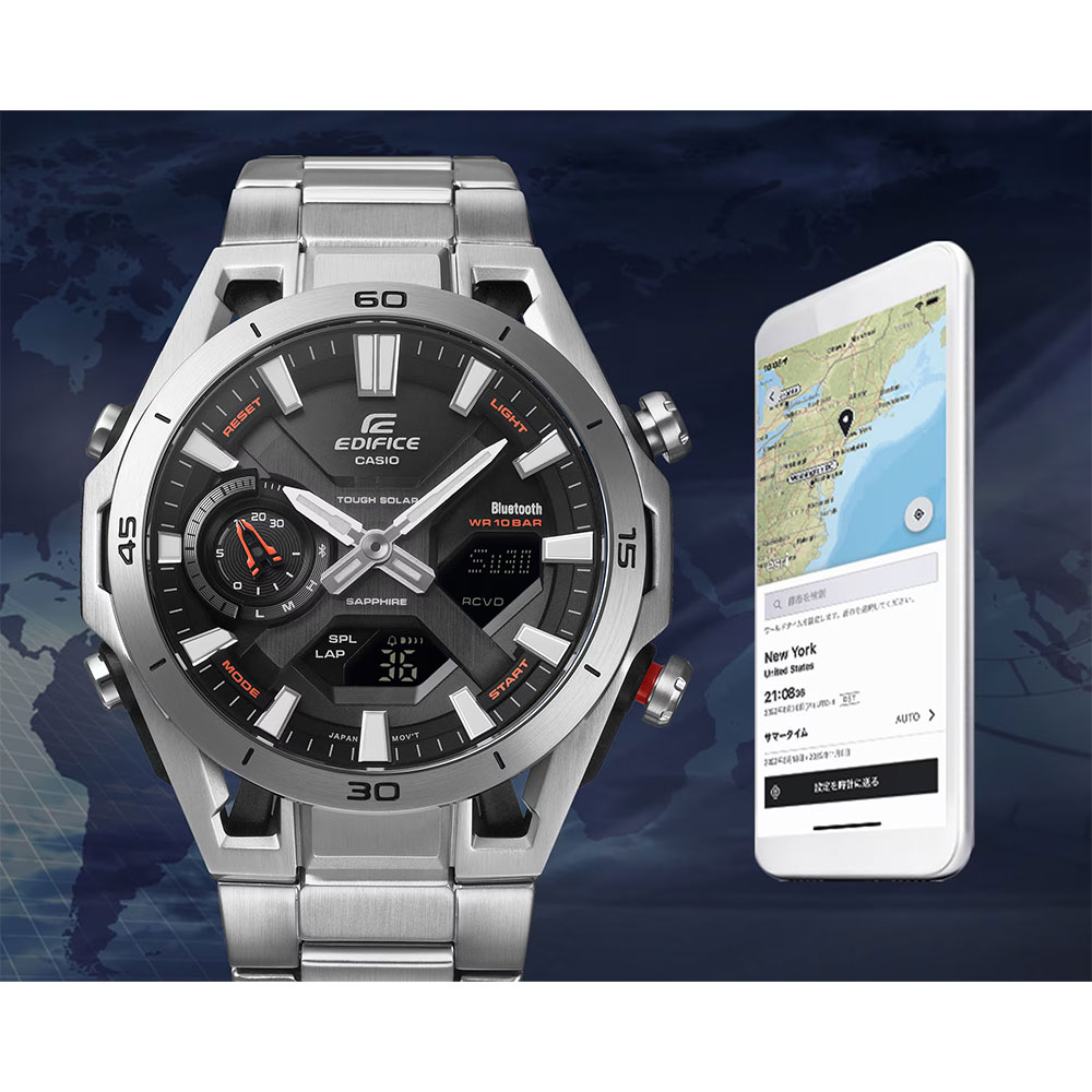 モータースポーツの世界からインスピレーションを得た「EDIFICE ECB-2300 SOSPENSIONE」です。 レーシングカーのダブルウィッシュボーンサスペンションをイメージしたラグデザイン。4か所に配されたプッシュロッド風のロッドが、モータースポーツの機能美を表現しています。 また、カーボンファイバー強化樹脂とステンレススチールを組み合わせたケースはレーシングマシンのように軽量かつ高剛性も備えています。 Bluetooth®搭載により、正確な時刻調整やワールドタイム設定などをアプリから簡単に操作可能。タフソーラーによる安定した電源供給、傷に強いサファイアガラス、実用的な10気圧防水など高い実用性も備えています。 モータースポーツへの情熱を日常に取り入れたい方に最適なタイムピースです。