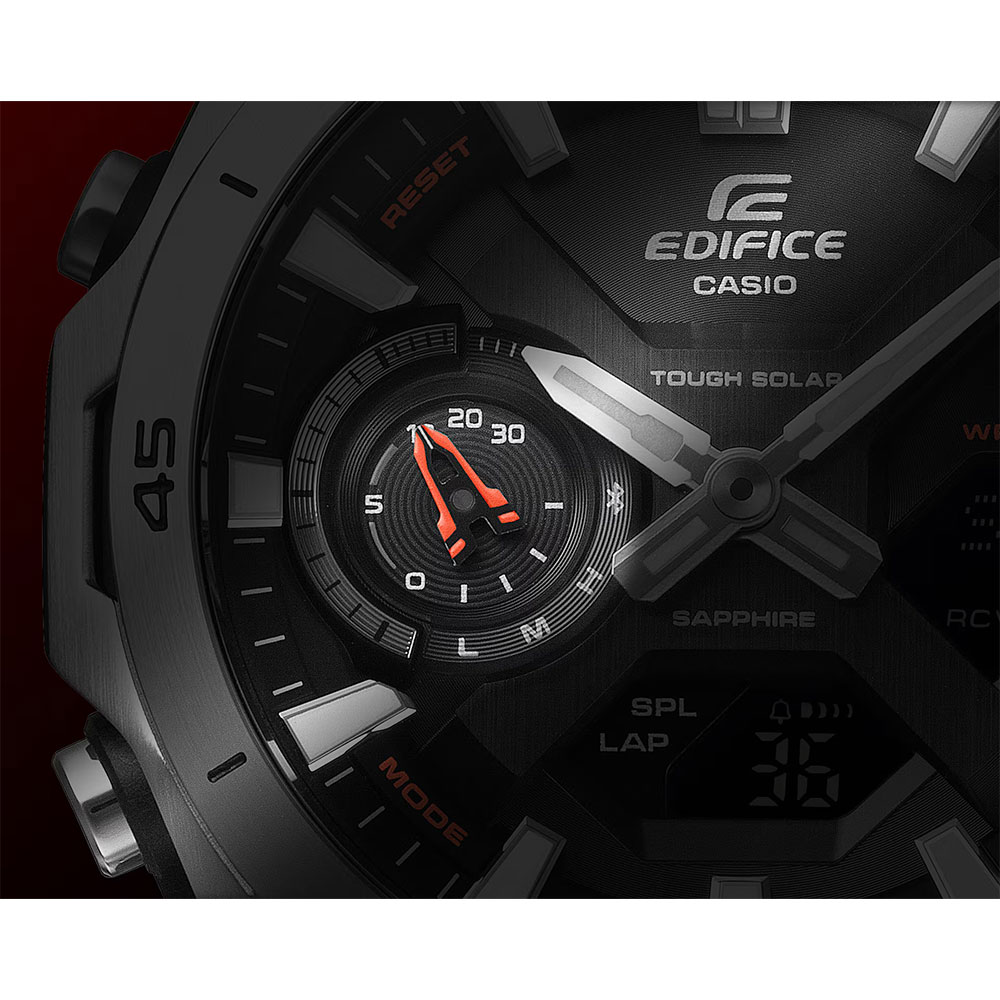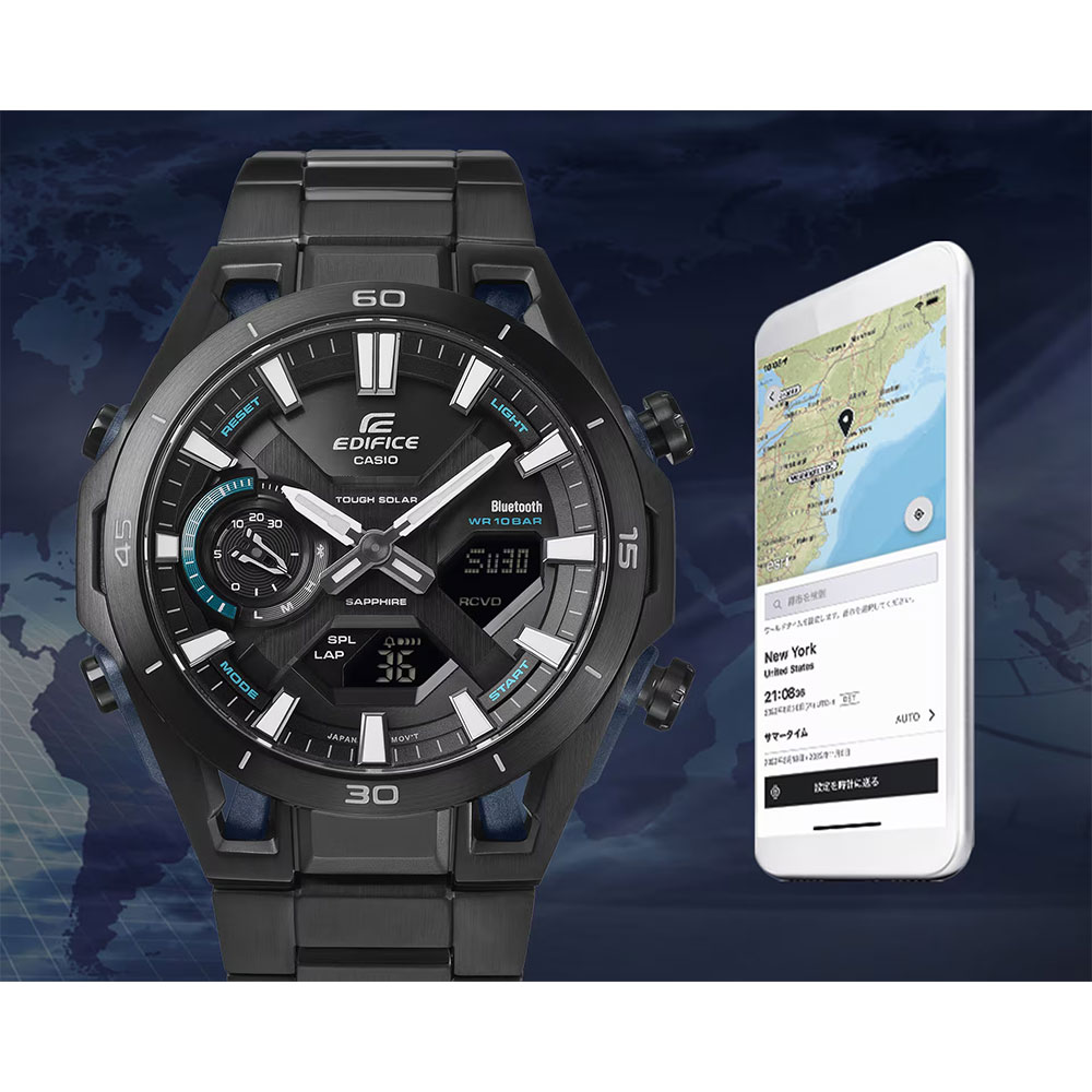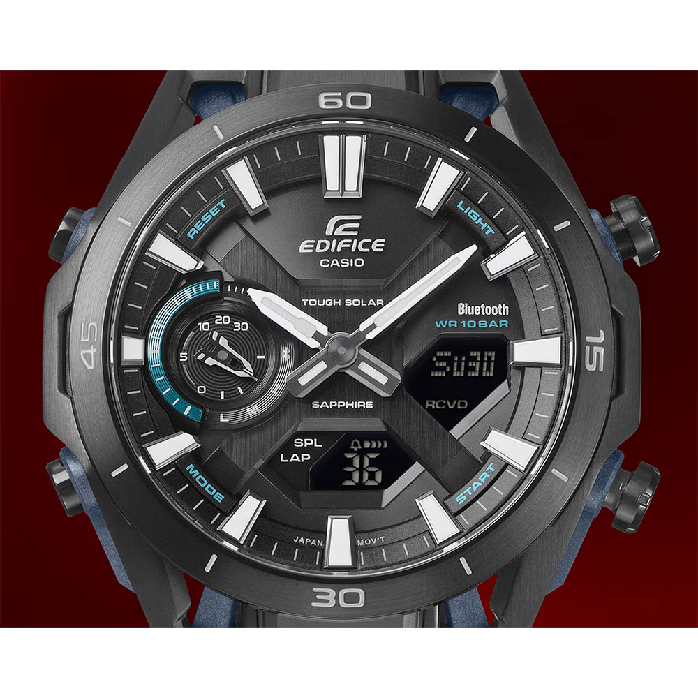 モータースポーツの世界からインスピレーションを得た「EDIFICE ECB-2300 SOSPENSIONE」です。 レーシングカーのダブルウィッシュボーンサスペンションをイメージしたラグデザイン。4か所に配されたプッシュロッド風のロッドが、モータースポーツの機能美を表現しています。 また、カーボンファイバー強化樹脂とステンレススチールを組み合わせたケースはレーシングマシンのように軽量かつ高剛性も備えています。 Bluetooth®搭載により、正確な時刻調整やワールドタイム設定などをアプリから簡単に操作可能。タフソーラーによる安定した電源供給、傷に強いサファイアガラス、実用的な10気圧防水など高い実用性も備えています。 モータースポーツへの情熱を日常に取り入れたい方に最適なタイムピースです。