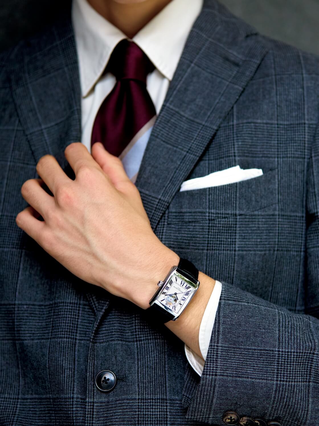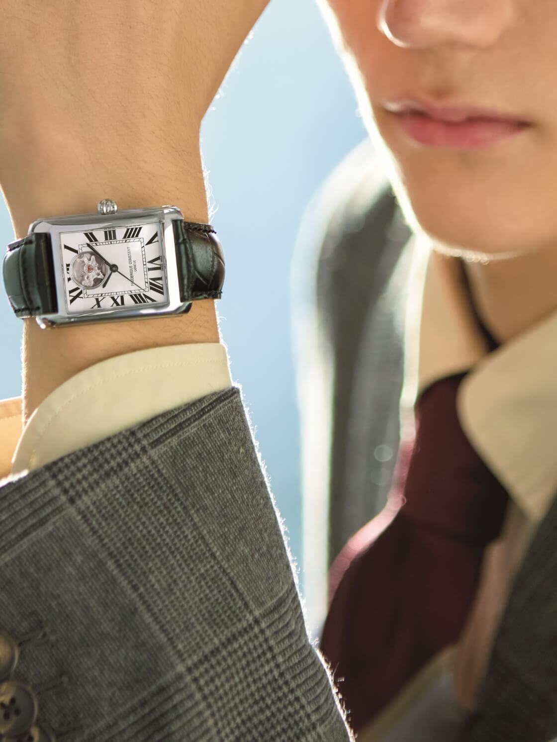 文字盤の小窓から機械式時計のテンプの動きを見せる“ハートビート”搭載のクラシックな角型“カレ”コレクション。緩やかにカーブするケースは腕にフィットし、ローマンインデックス、ケースデザインに合わせたレイルウェイデザイン、そしてオニオンリューズ。クラシカルエレガントなデザインがどのシーンでも自信を持って身につけていただける上品な一本です。