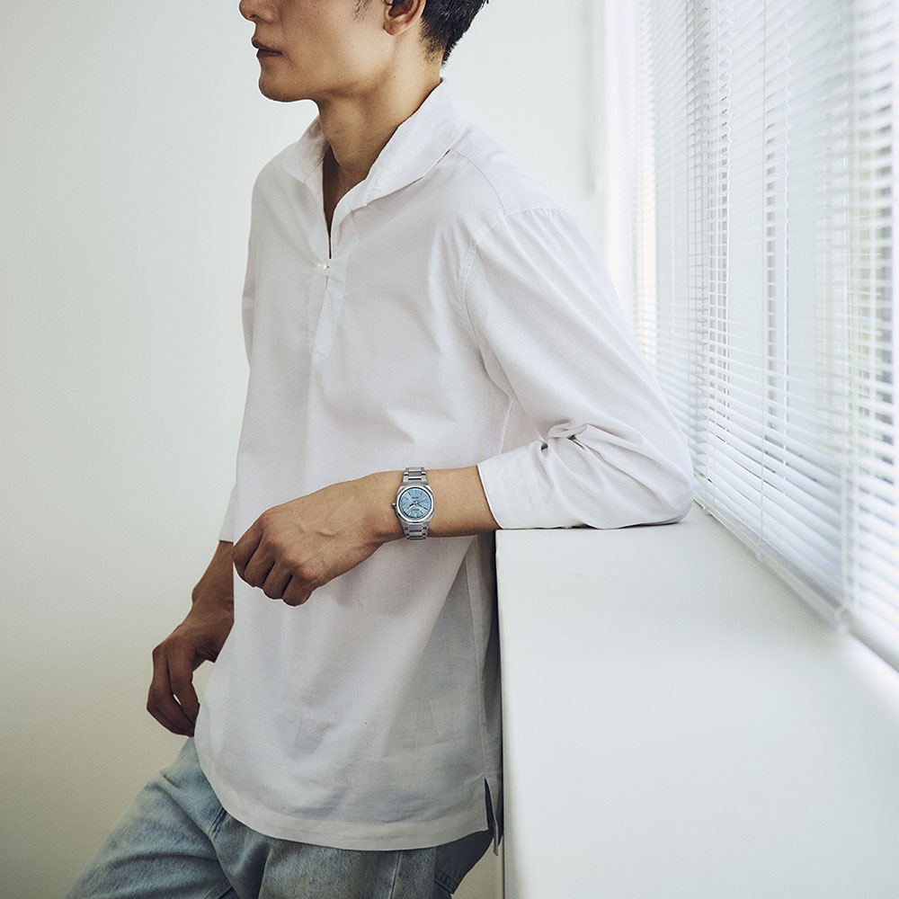 ケース径36mm/厚み8.7mmという薄型でコンパクトなサイズながら、エッジの効いた多角形状のチタン製ベゼル、ソリッドなケース造形、ケース/バンド一体型の先進的なフォルムが特徴。
