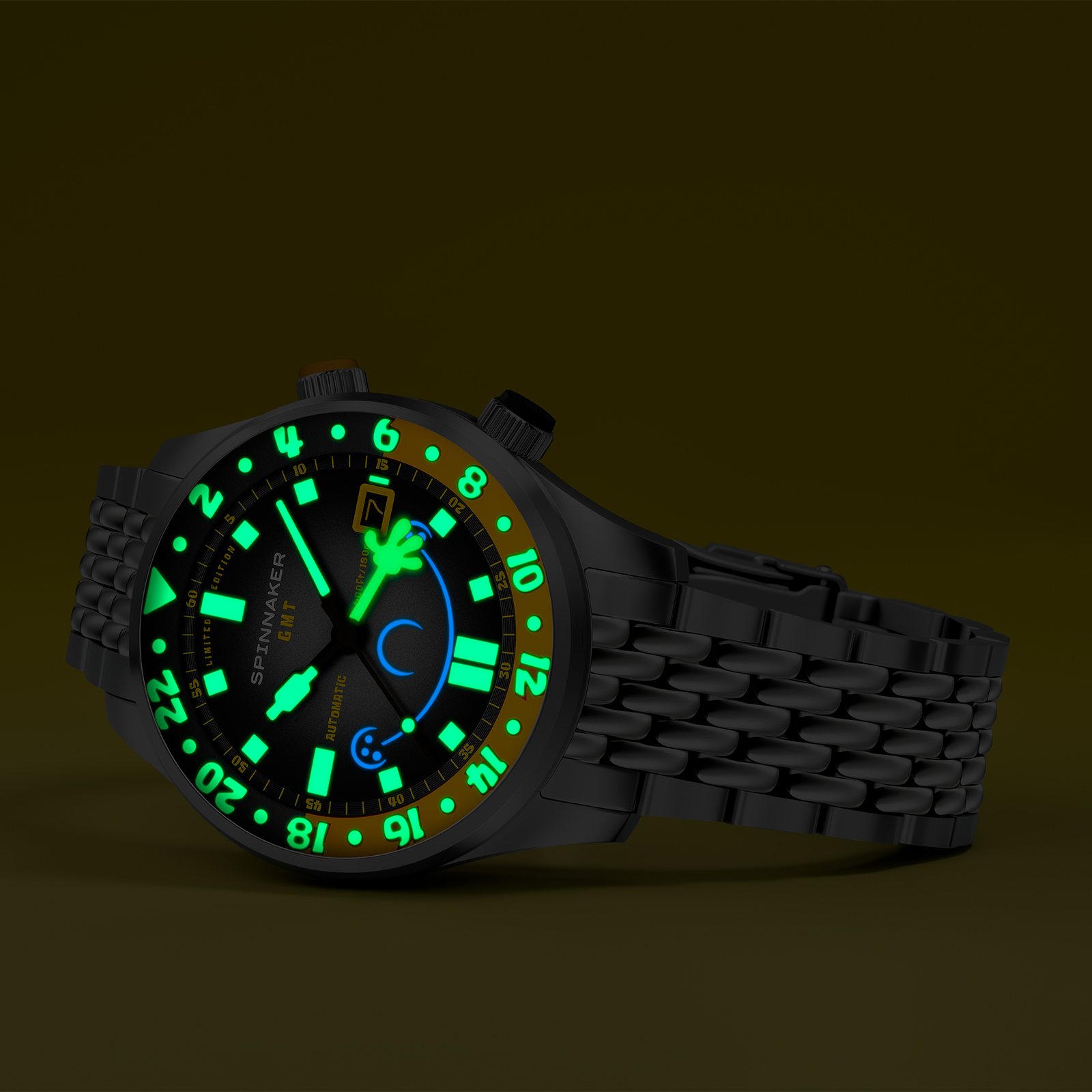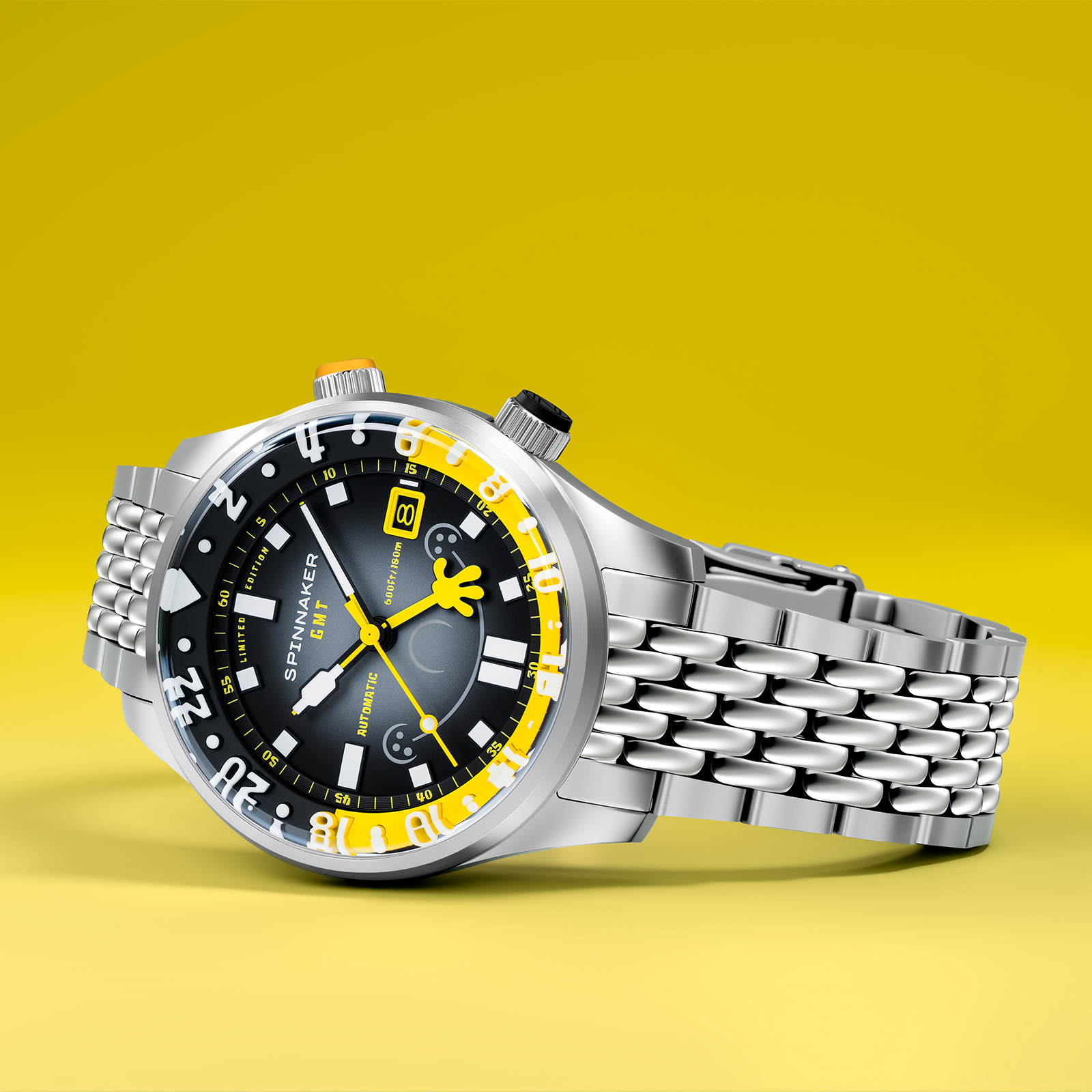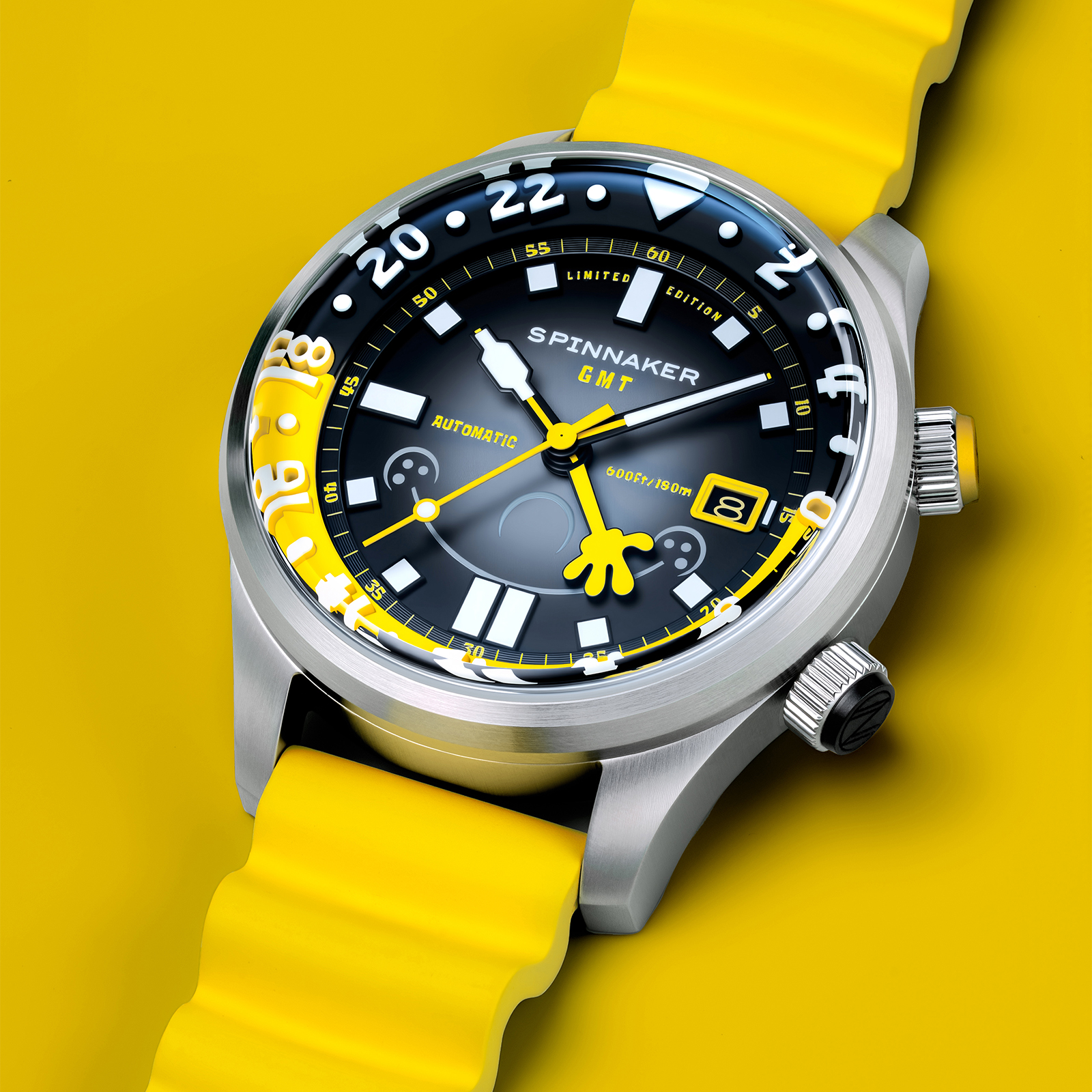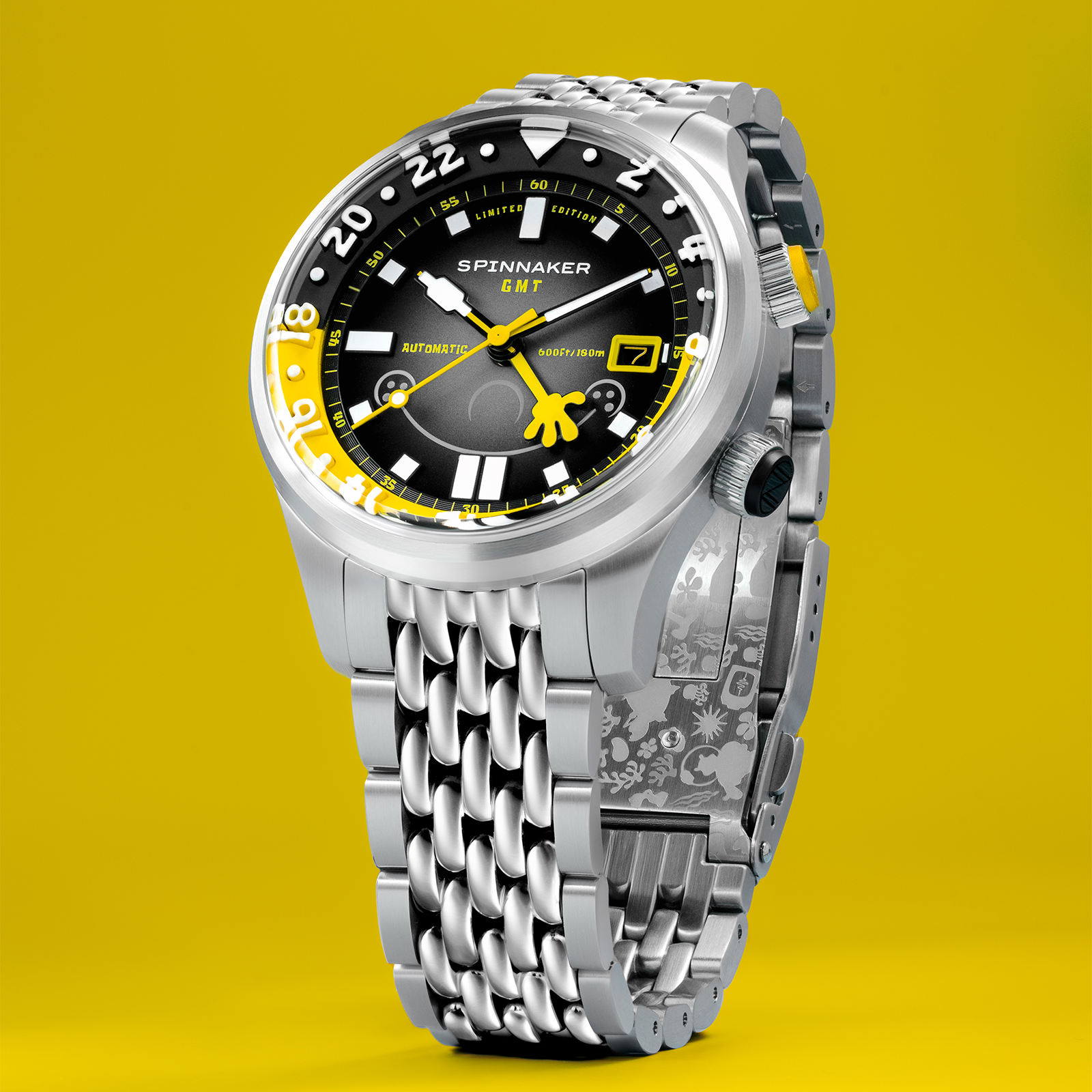 「イマジネーション!」を大切にするスポンジ・ボブの理念を、スピニカーは蓄光塗料とGMT針によって表現。