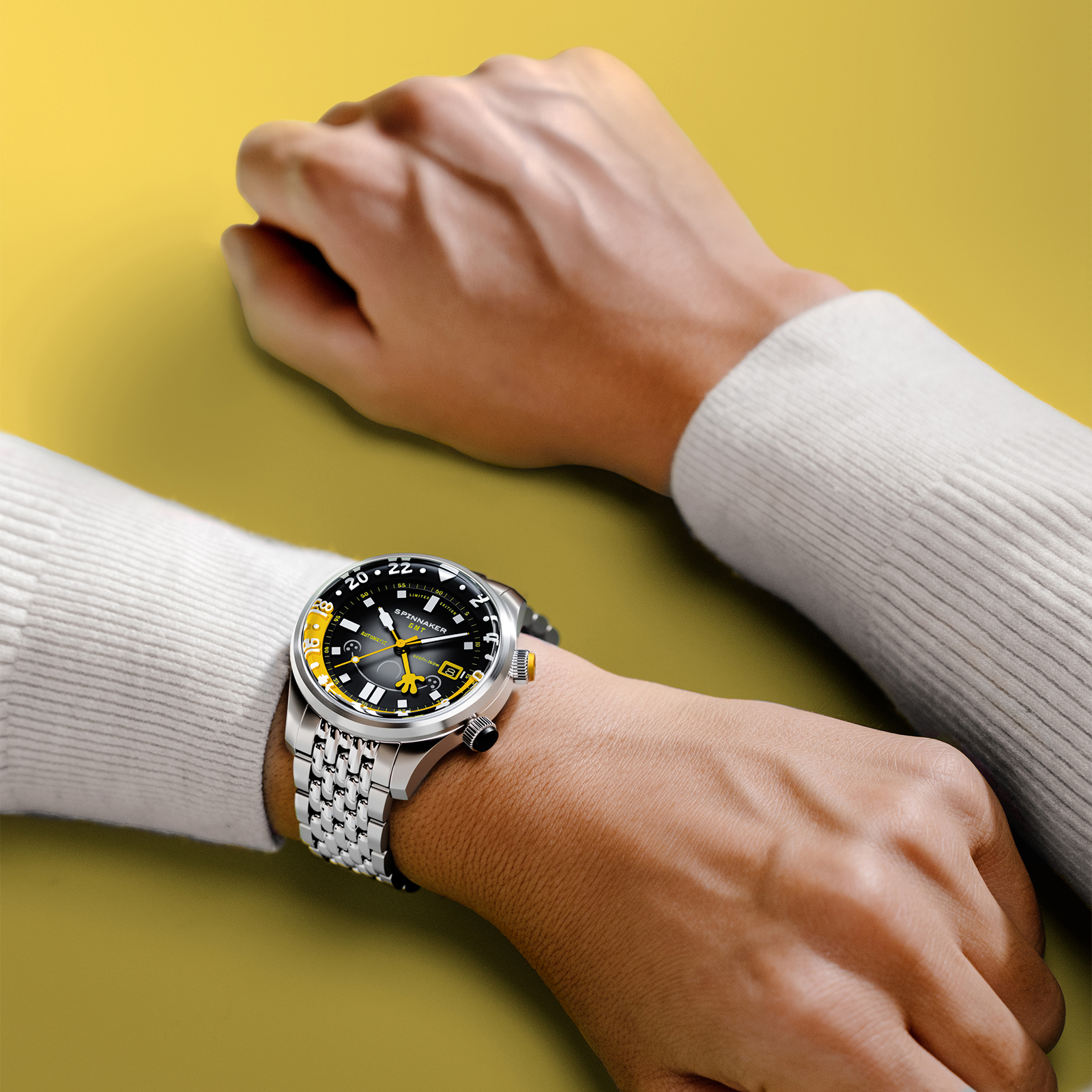 GMT針にも、彼らにちなんだモチーフにデザインしています。「スポンジ・ボブ イエロー」では特徴的な彼の手のひらを表現し、特徴を捉えました。