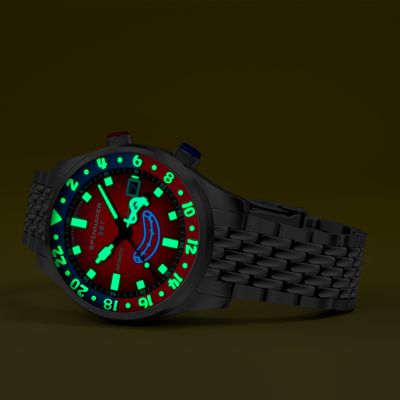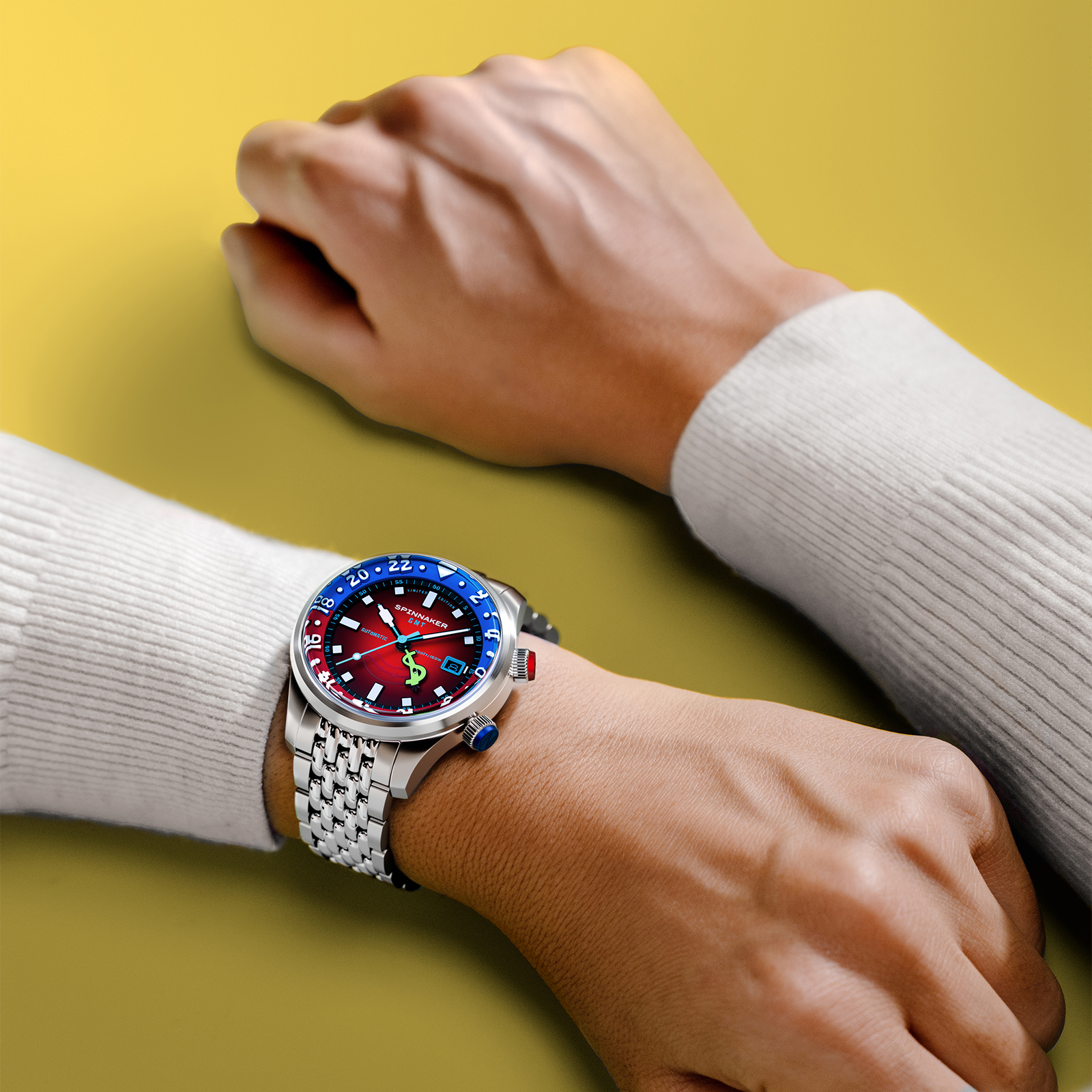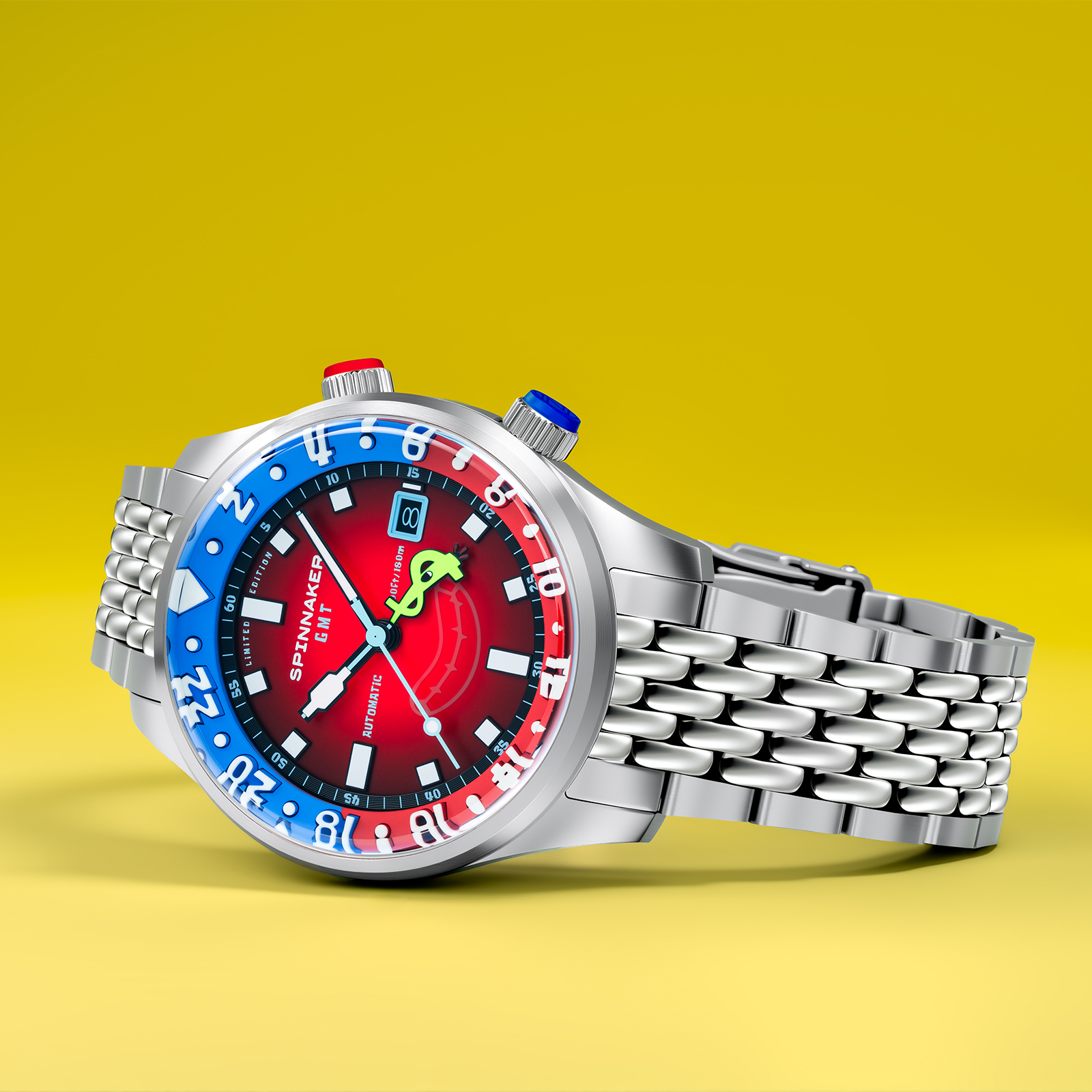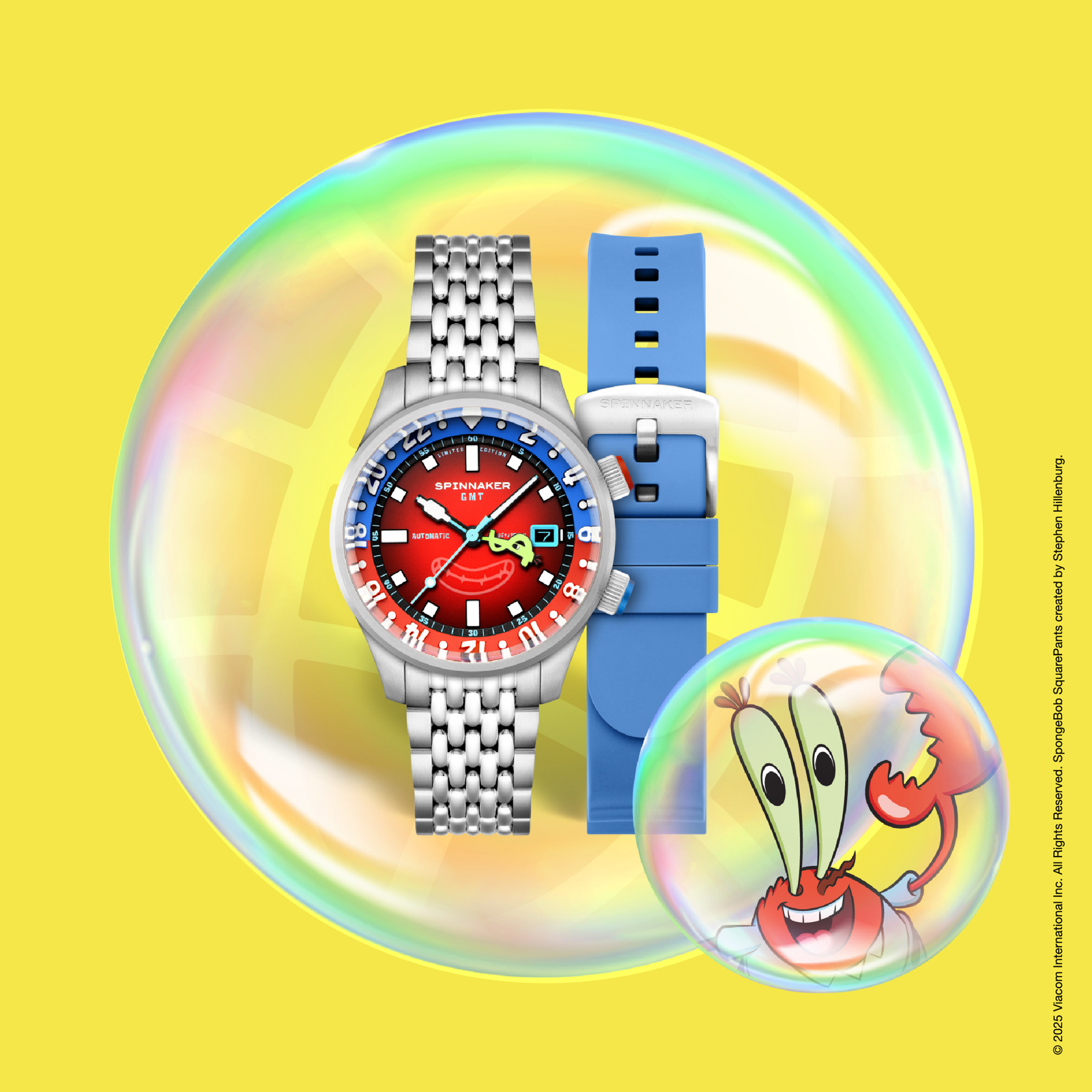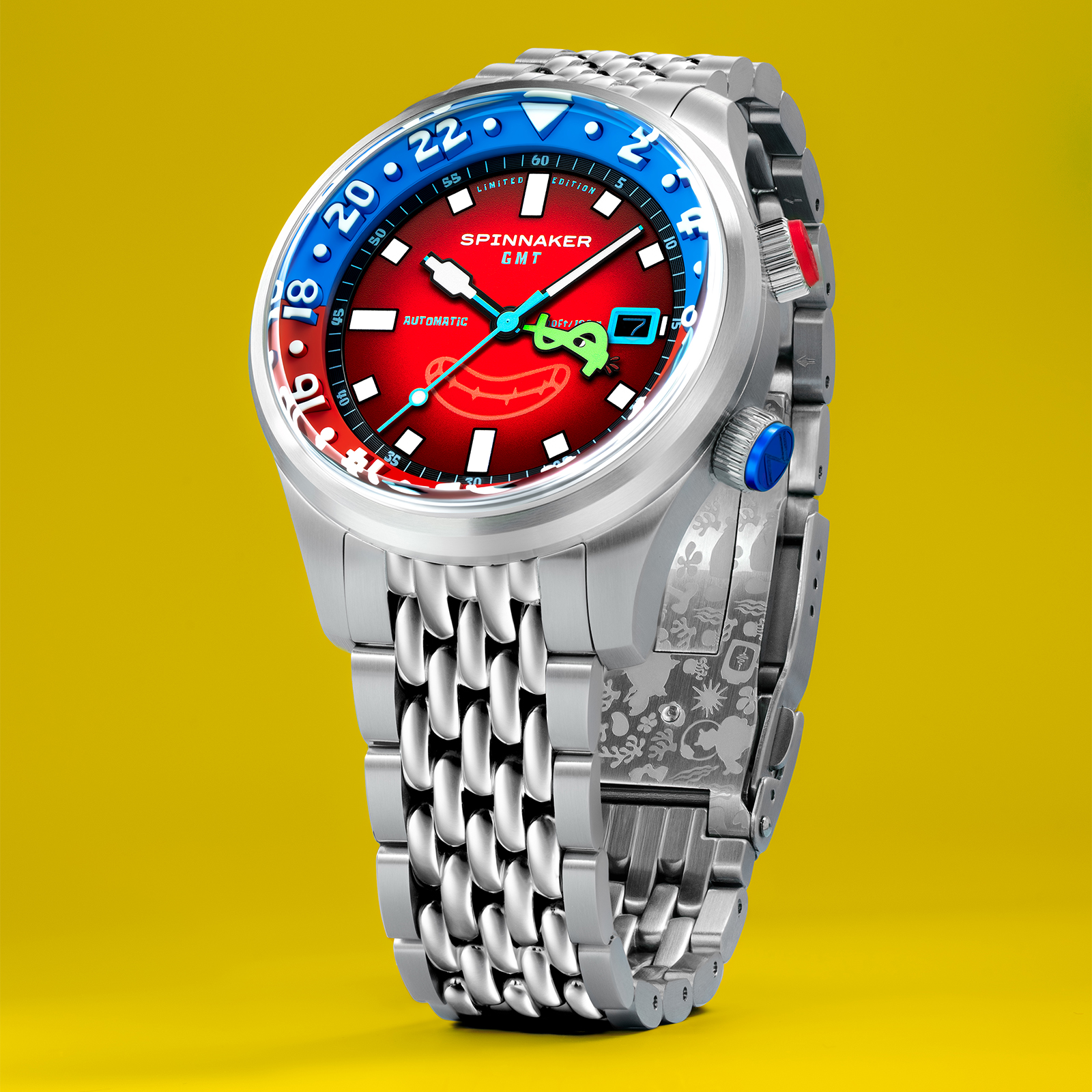「イマジネーション!」を大切にするスポンジ・ボブの理念を、スピニカーは蓄光塗料とGMT針によって表現。