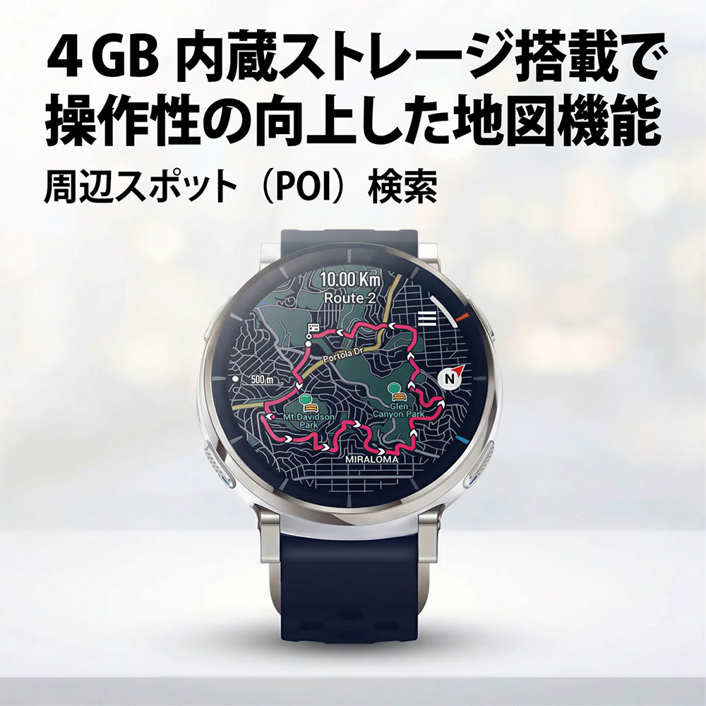 ウォッチ上で直接、またはZeppアプリでルート作成可能。ターンバイターン方式のルート案内、オフラインでのポイントツーポイントルートプランニング、チェックポイント情報とリマインダー、近隣のPOI(興味のある場所)、自動ルート変更機能