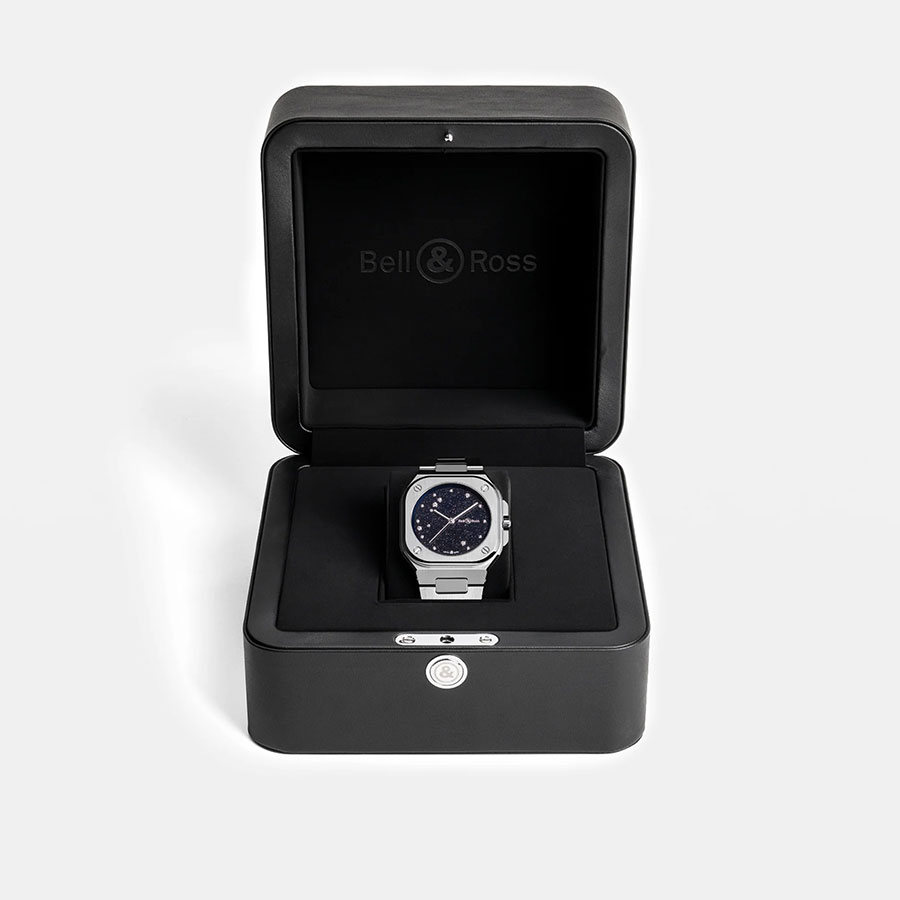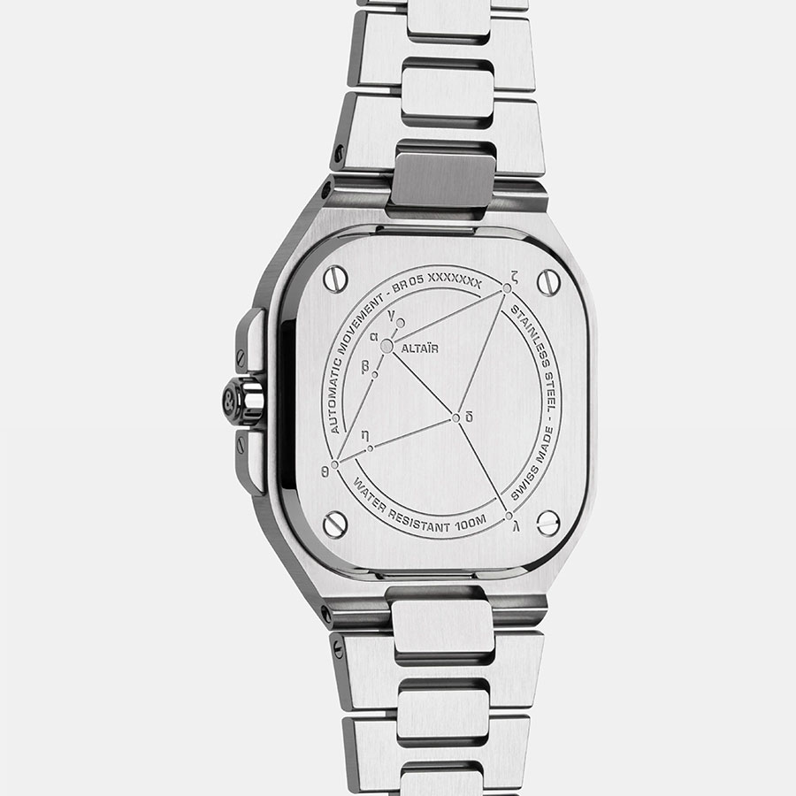 BR-05 Blue Diamond Eagleは36 mm ケースで登場 。スクエアケースに収まるラウンドベゼルの力強いグラフィック性と、わし座から着想を得たダイヤルの繊細な輝きが響き合う。