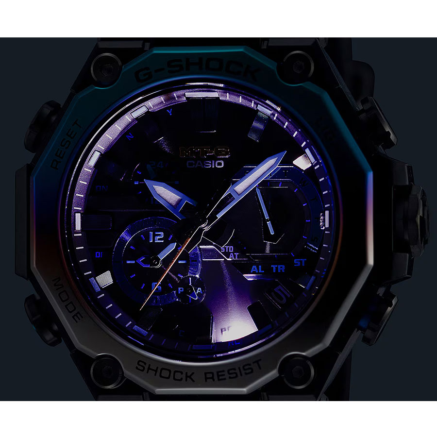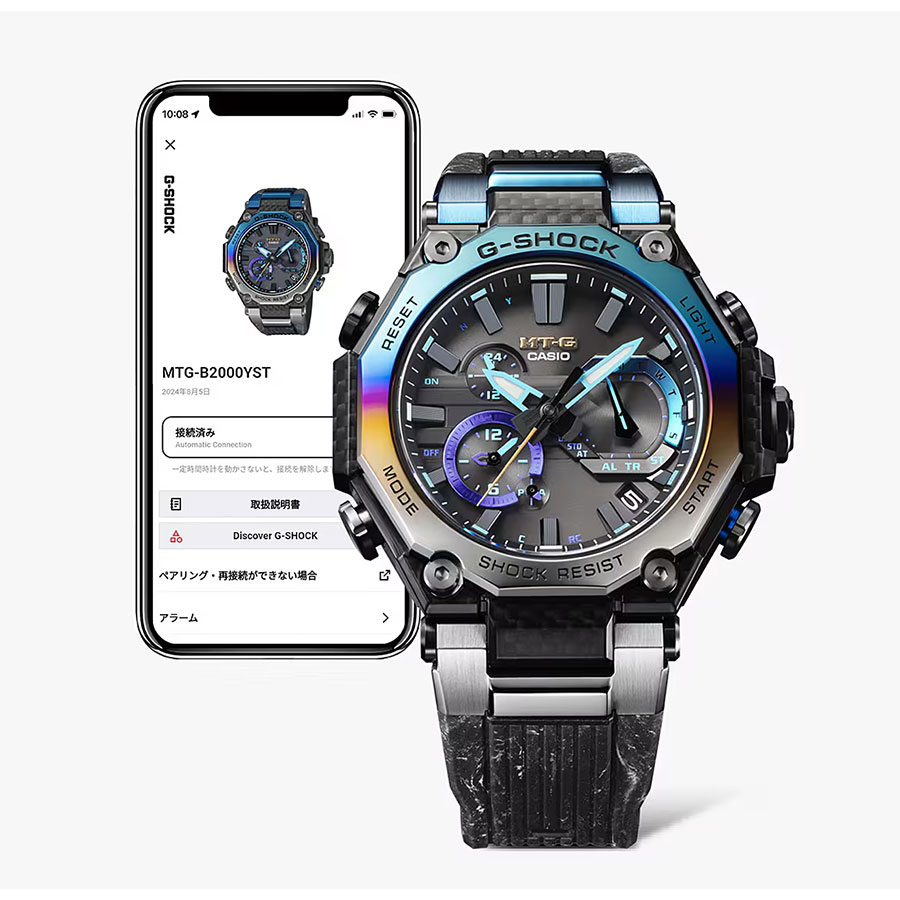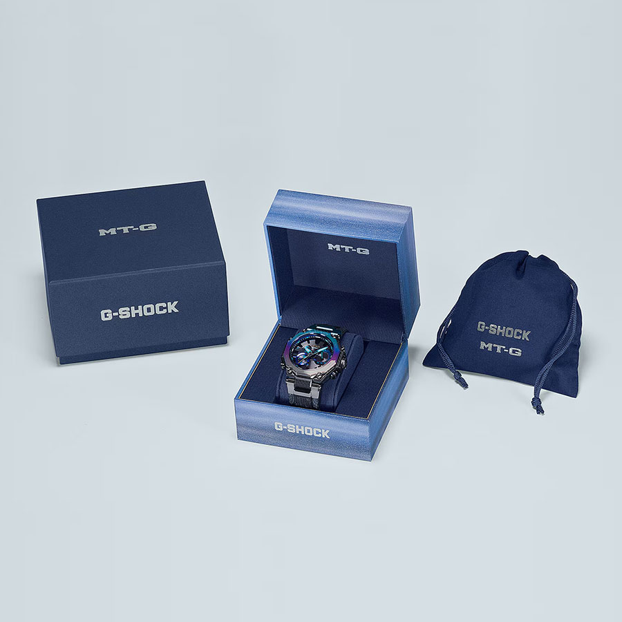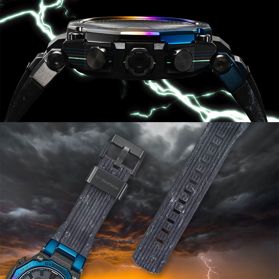G-SHOCKの起源である樹脂素材とメタル素材を融合して、革新的な構造美を追求するMT-Gシリーズ。 竜巻などの悪天候を追跡し、気象学の研究を行うストームチェイサーをテーマにデザインしたモデルです。 カーボンとグラスファイバーによるカーボン積層フレームは、蓄光素材により垂れ込める暗雲と一閃の稲妻を表現しました。ステンレスベゼルには2色のIPコーティングを施し、グラデーションカラーで急変する天候を表現。 バンドには、しなやかで耐久性の高いソフトウレタン素材を採用し、異なる色の樹脂を混ぜ合わせて成形することで、激しい自然現象をデザインに落とし込んでいます。 機能面ではBluetooth® 通信により専用アプリ「CASIO WATCHES」と接続し時刻情報を取得可能。マルチバンド6やタフソーラー、高輝度なLEDライトも搭載し、実用的な機能を備えます。 ※製造上の都合により、ベゼル・バンドの色調には個体差があります。