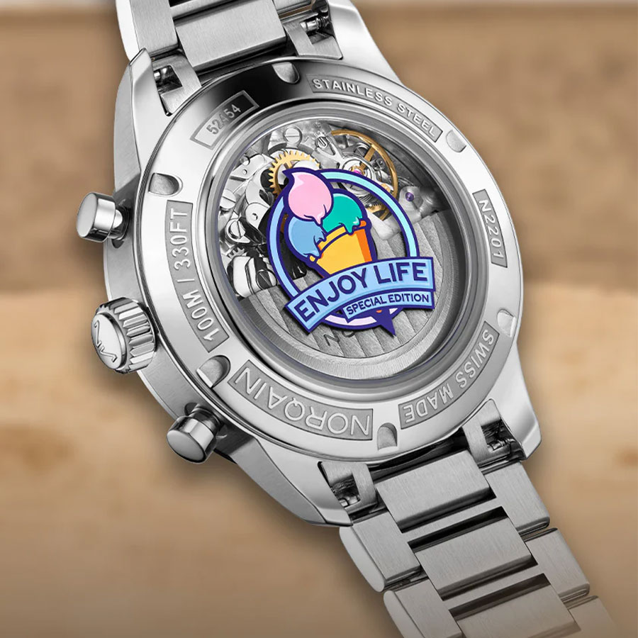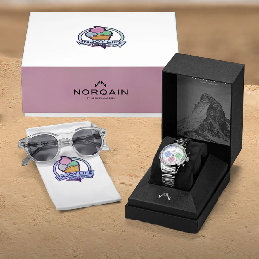 NORQAIN創業者兼CEOのベン・カッファーは次のように語っています:「“Enjoy Life” スペシャルエディションは、誰の中にもいる“子ども心”へのオマージュでもあります。デイト表示の小さなアイスクリームは、ただの遊び心のあるデザインではなく、“もっと肩の力を抜いて人生を楽しもう”というメッセージなのです。子どもの頃の記憶を呼び起こしたり、今の子どもたちの笑顔と重ねたり――この時計は、そんな“ピュアで心が弾むようなエネルギー”を、あなたの毎日に届けてくれます。」