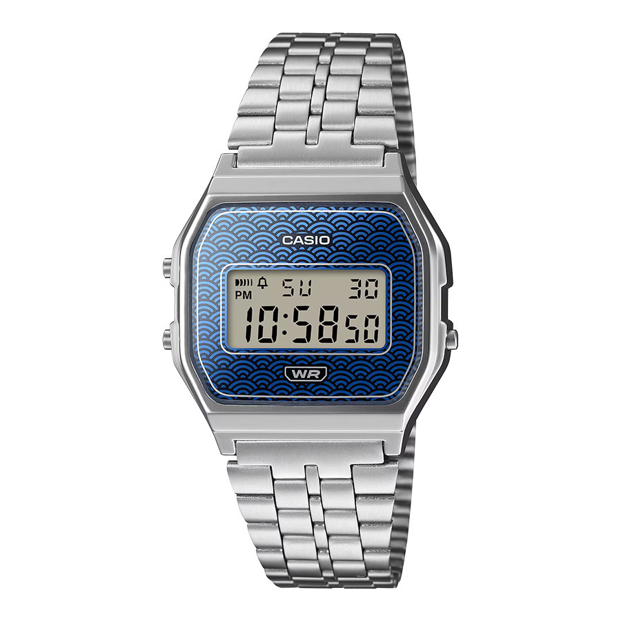 日本の美意識をさりげなく息づかせた、メイドインジャパンがテーマのA159です。 山形カシオで製造されたA159をベースに、フェイスには伝統的な模様の「青海波(せいがいは)」をあしらいました。青海波は、同心円の弧が重なって波のように見え、波が途切れず続くことから幸運や穏やかな日々が長く続くよう願いが込められています。 ダイアルは蒸着処理と印刷を組み合わせた上品な仕上げ。光の当たり方で控えめにきらめき、デジタル表示とのコントラストを引き立てます。カラーは濃藍を用い、深みのある佇まいで落ち着いた印象に仕上げました。 裏蓋にはカタカナで「カシオ」をレイアウトし、日本発のものづくりをさりげなく表現。 特別感のあるスペシャルパッケージ付きで、記念品やギフトにもふさわしい一本です。
