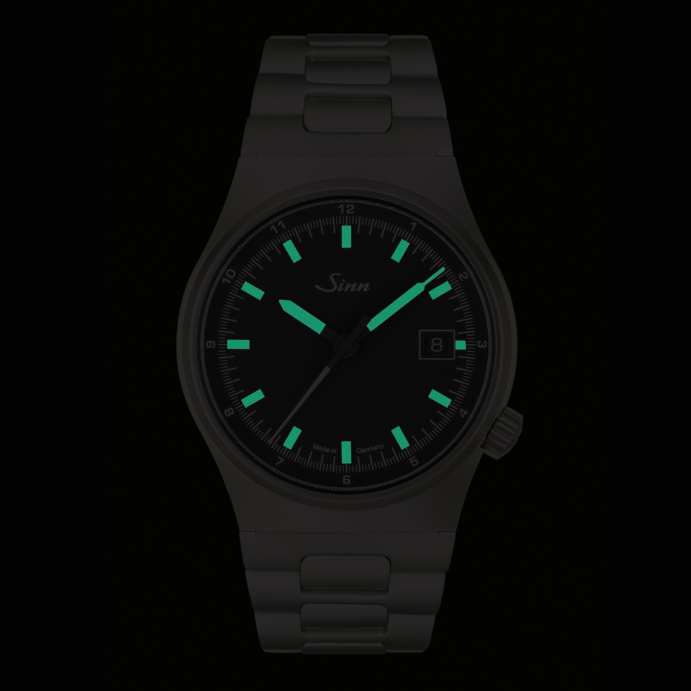 このモデルには、ほこりや湿気の侵入を防ぐ確かな保護機構としてSINN独自のD3システムを採用しています。手作業で配置したハイブリッド・セラミック製の夜光インデックスにより、優れた視認性を確保。