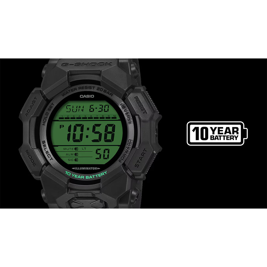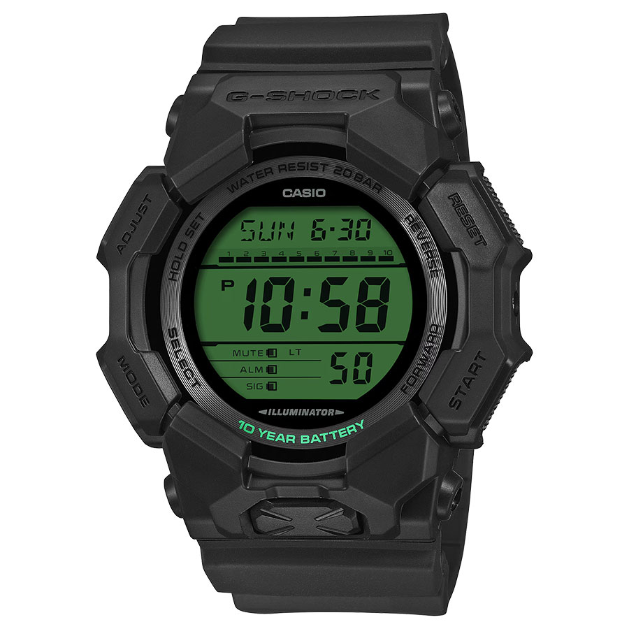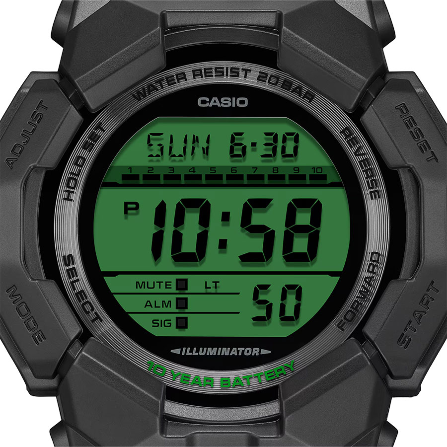 タフネスを追求し進化を続けるG-SHOCKから「BLACK AND ELECTRO GREEN」のご紹介です。 ベゼル・バンド・文字板にブランドの基調色であるブラックを採用し、フェイスの液晶部分にはエレクトログリーンのカラー印刷を施すことで視覚的なアクセントとデザイン性を高めました。 ライト点灯時にはデジタル表示の文字部分が発光し、暗所での視認性を確保します。 洗練されたブラックを基調に、エレクトログリーンが放つ鮮烈なコントラストで、クールかつモダンな表情となっています。 ※ケース、ベゼル、バンドの主な樹脂パーツにバイオマスプラスチックを使用。 原料に再生可能な有機資源を使用し、環境負荷低減への貢献が期待されています。