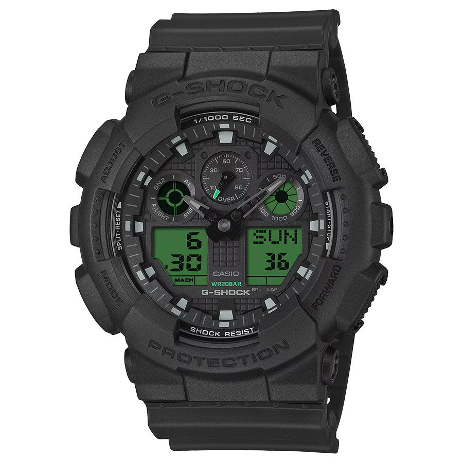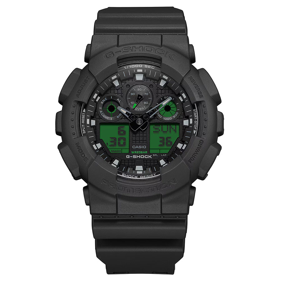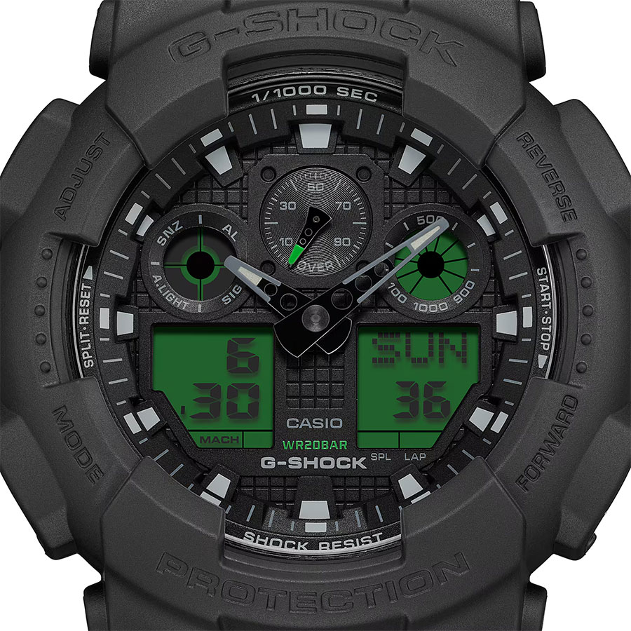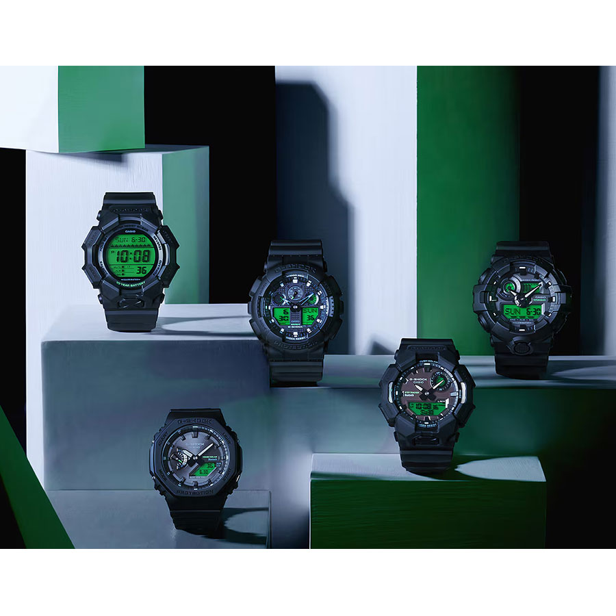 タフネスを追求し進化を続けるG-SHOCKから「BLACK AND ELECTRO GREEN」のご紹介です。 ベゼル・バンド・文字板にブランドの基調色であるブラックを採用し、フェイスの液晶部分にはエレクトログリーンのカラー印刷を施すことで視覚的なアクセントとデザイン性を高めました。 ライト点灯時にはデジタル表示の文字部分が発光し、暗所での視認性を確保します。 洗練されたブラックを基調に、エレクトログリーンが放つ鮮烈なコントラストで、クールかつモダンな表情となっています。