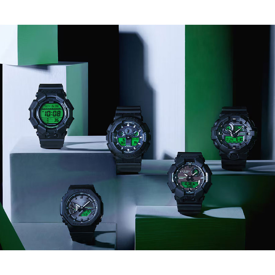 タフネスを追求し進化を続けるG-SHOCKから「BLACK AND ELECTRO GREEN」のご紹介です。 ベゼル・バンド・文字板にブランドの基調色であるブラックを採用し、フェイスの液晶部分にはエレクトログリーンのカラー印刷を施すことで視覚的なアクセントとデザイン性を高めました。 ライト点灯時にはデジタル表示の文字部分が発光し、暗所での視認性を確保します。 洗練されたブラックを基調に、エレクトログリーンが放つ鮮烈なコントラストで、クールかつモダンな表情となっています。 ※ベゼル、バンドの主な樹脂パーツにバイオマスプラスチックを使用。 原料に再生可能な有機資源を使用し、環境負荷低減への貢献が期待されています。