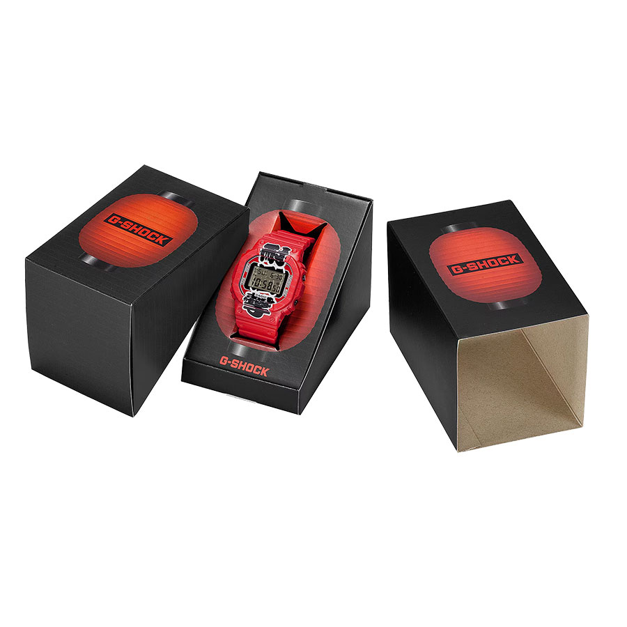 G-SHOCKから、日本の酒場文化を象徴する「赤提灯」をデザインモチーフにしたモデルです。 仕事帰りなどに手軽にお酒や食事を楽しむ場所の象徴として、人々の心に温かさと活気をもたらしてきた日本ならではの文化「赤提灯」。今回はMade in Japanモデルとしてその温かみをG-SHOCKに込めています。 提灯の赤をベースカラーに、ベゼルからバンドまで、G-SHOCKの最たる特徴である「耐衝撃」のプリントを配したユニークなデザイン。バックライトのカラーや持ち手の色味にインスパイアされたボタンと遊環など、こだわりの仕様となっています。裏蓋にも提灯のモチーフを刻印し、パッケージにも赤提灯を大胆にあしらった特別仕様です。 ※ベゼル、バンドの主な樹脂パーツにバイオマスプラスチックを使用。 原料に再生可能な有機資源を使用し、環境負荷低減への貢献が期待されています。